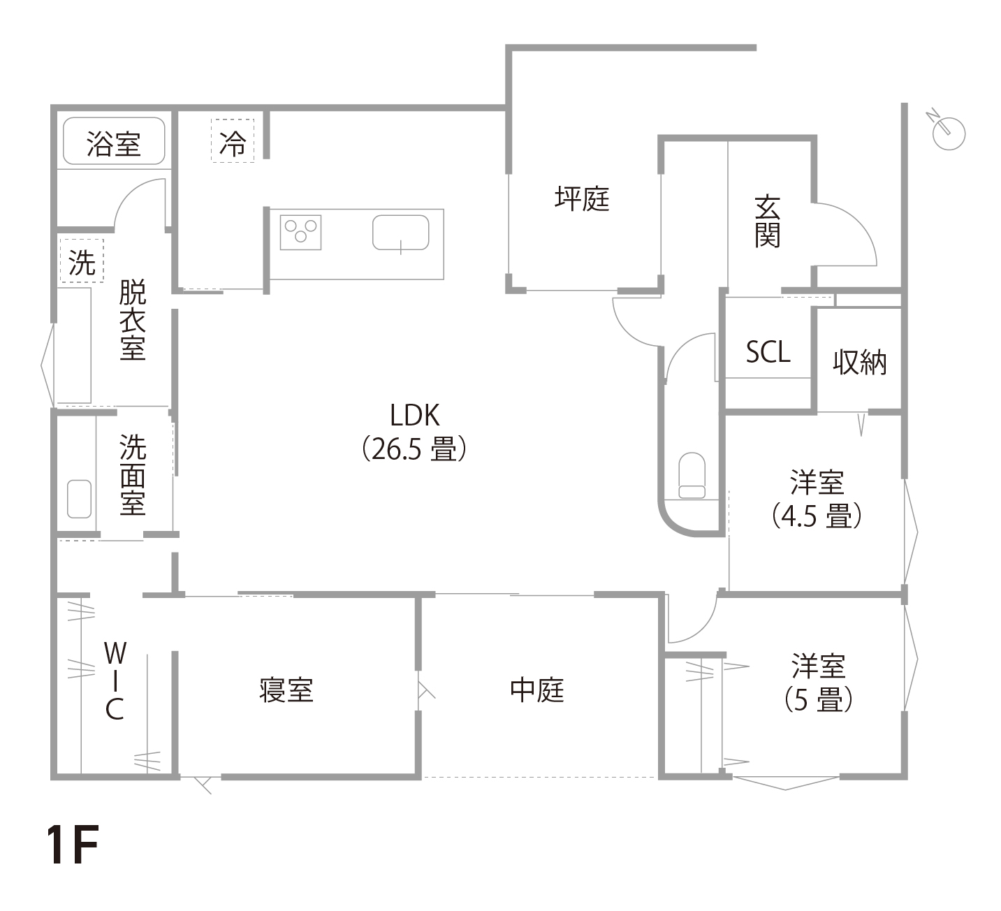 ■主な特徴: 脱衣室兼ランドリールーム、シューズクローク、ウォークスルータイプのパントリー、勾配天井、中庭、坪庭、北欧風スタイル