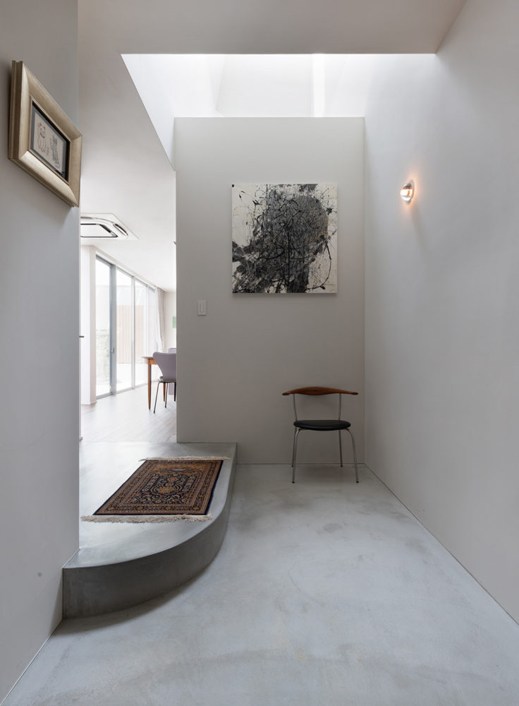 玄関ホールは、明るいグレーの塗り壁が印象的です。LDKへとつながる吹き抜けから光が注ぐ設計とし、洗練された雰囲気を演出。さらに、リビングとの間を壁で仕切らず吹き抜けでつなぐことで、空間に一層の広がりをもたらしています。