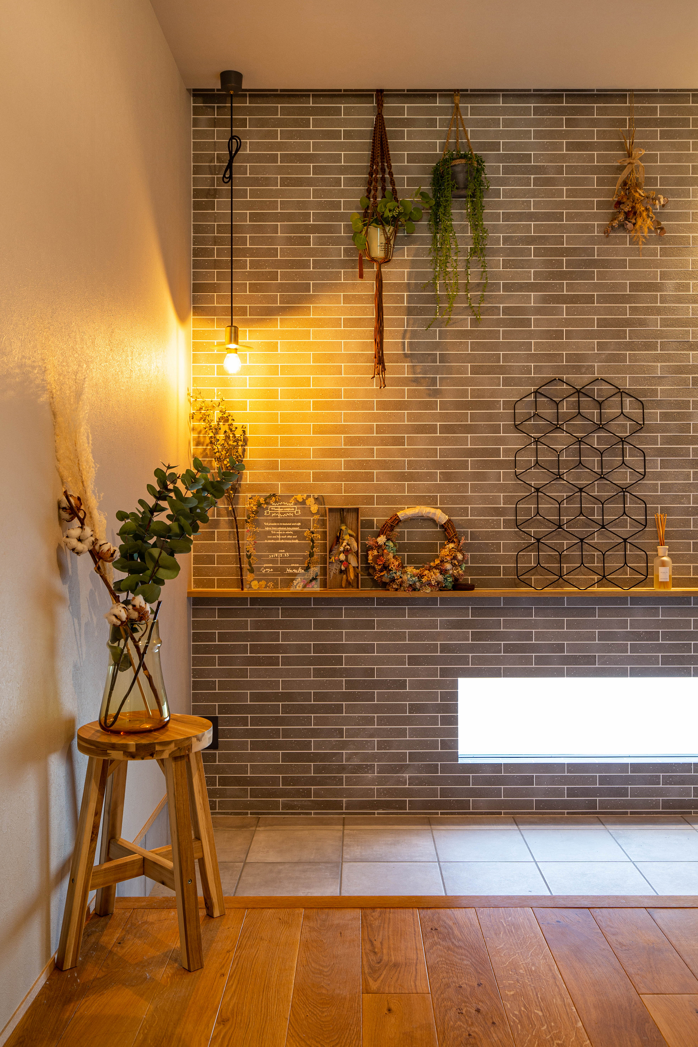 また、土間はダウンライトを極力使わず、真鍮(しんちゅう)のペンダントライトやブラケットライトで陰影を楽しむ照明計画を採用。上質で奥行きある空間を演出しました。壁面には、ご夫婦が挙式を上げた会場で使われていたものと同じタイルを使用しています。