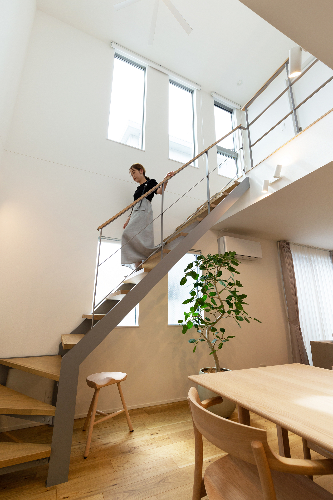 また、色の使い方にも工夫が施されています。黒が選ばれがちな鉄骨階段には、あえてライトグレーを採用。窓枠をホワイトで統一することで視覚的な広がりを生み出しています。さらに、リビングの壁を淡いグレーにすることでメリハリを持たせながらも、空間全体がより広く感じられる仕上がりです。