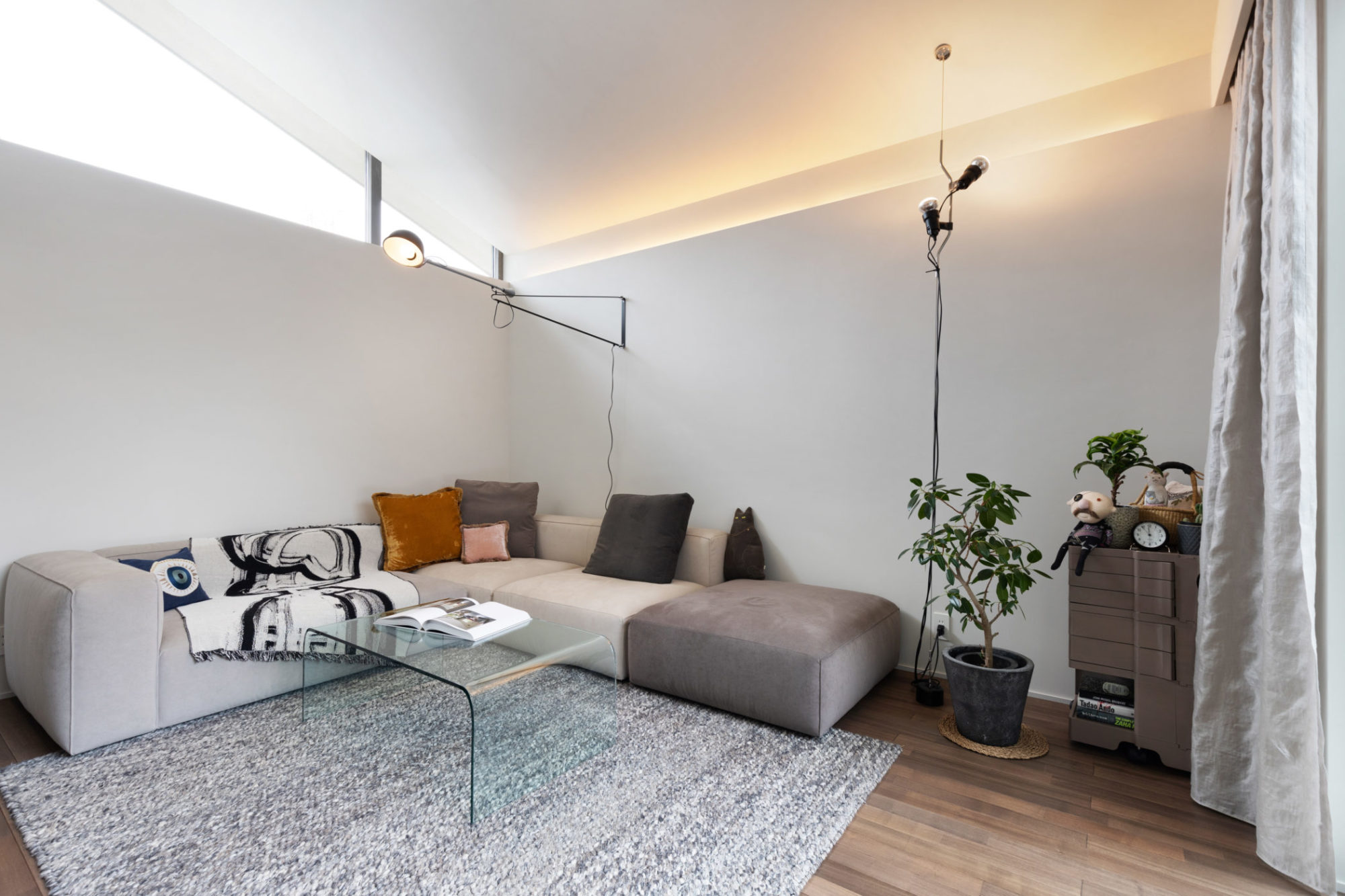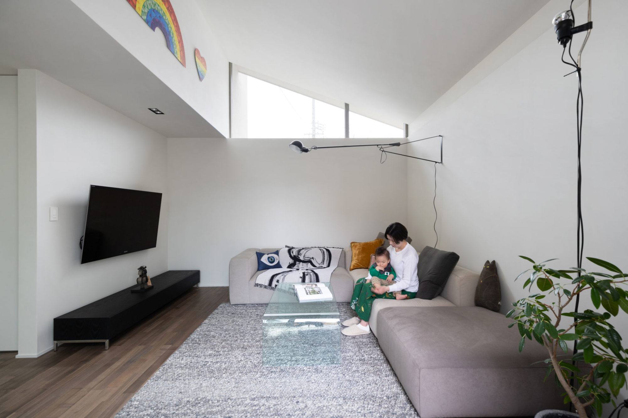 リビングは大きな家具を配置しても圧迫感が出ないよう、ゆとりある広さを確保しました。特徴的なのは、ご主人様たっての希望で設置された三角形の窓です。明るいグレーの塗り壁は、間接照明や窓からの自然光が優しく反射するよう設計されています。