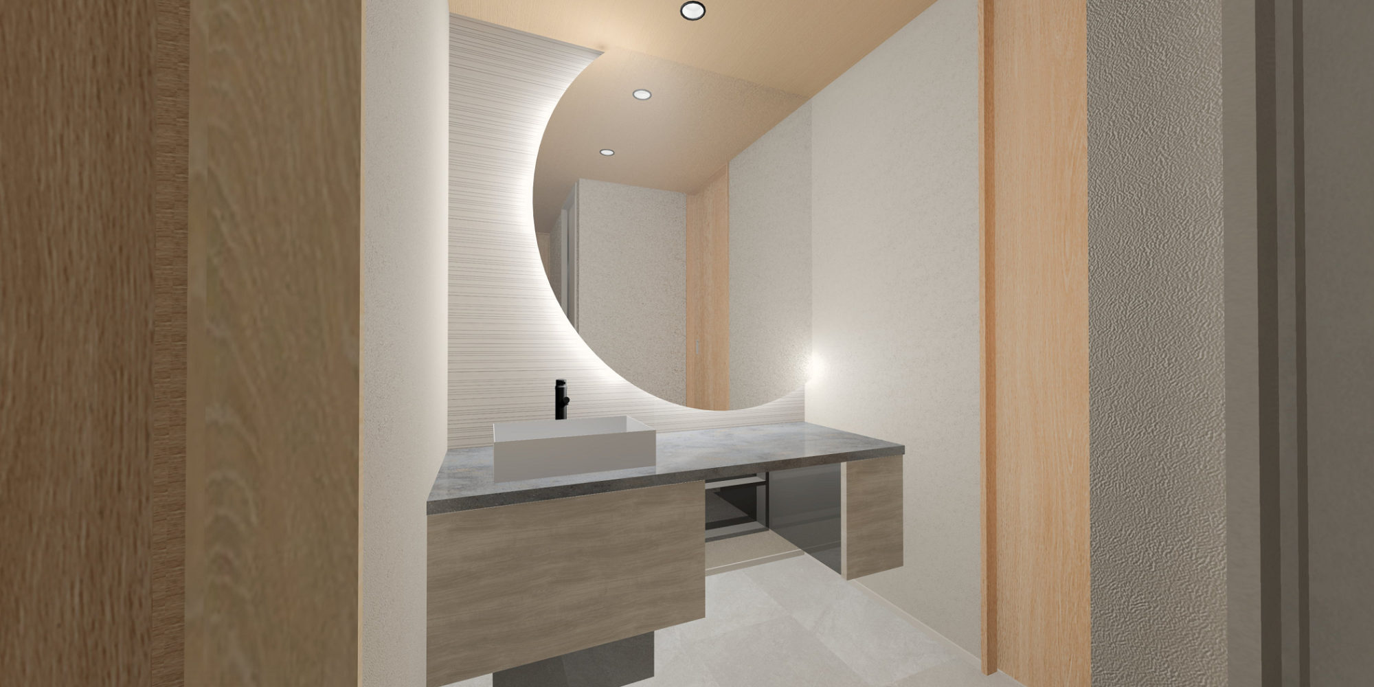 日常使いのしやすさを大切にしながら、石目調デザインと半月形ミラーで非日常感を演出。