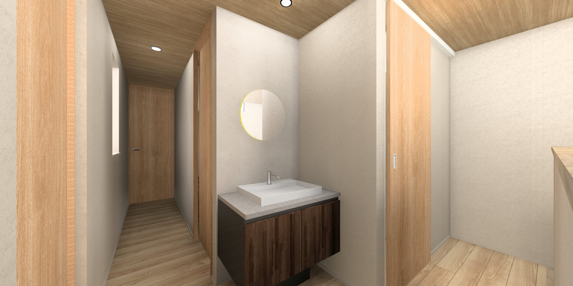 造作洗面も設け、住まいの「顔」として印象に残る空間としています。