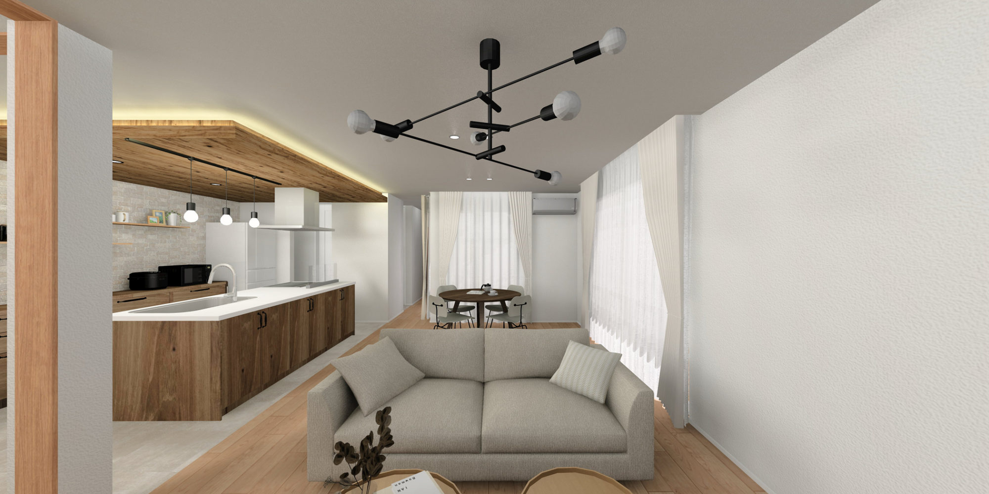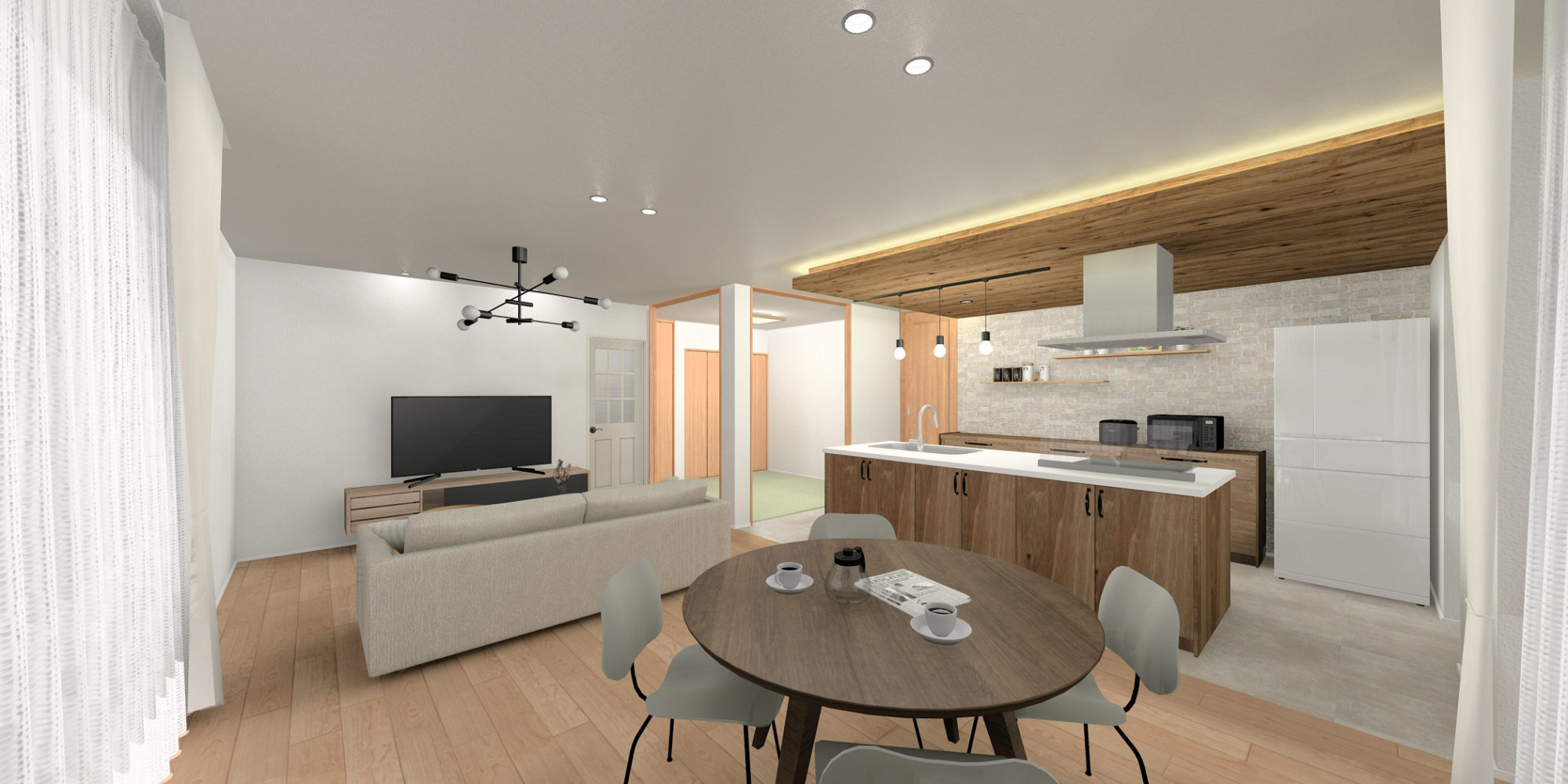 室内は、扉や下がり天井に木目を取り入れ、ナチュラルで柔らかな雰囲気にコーディネート。