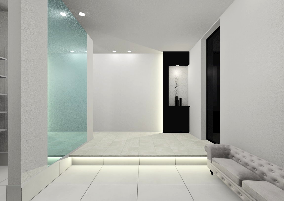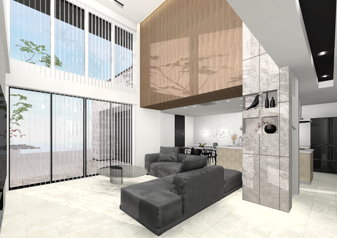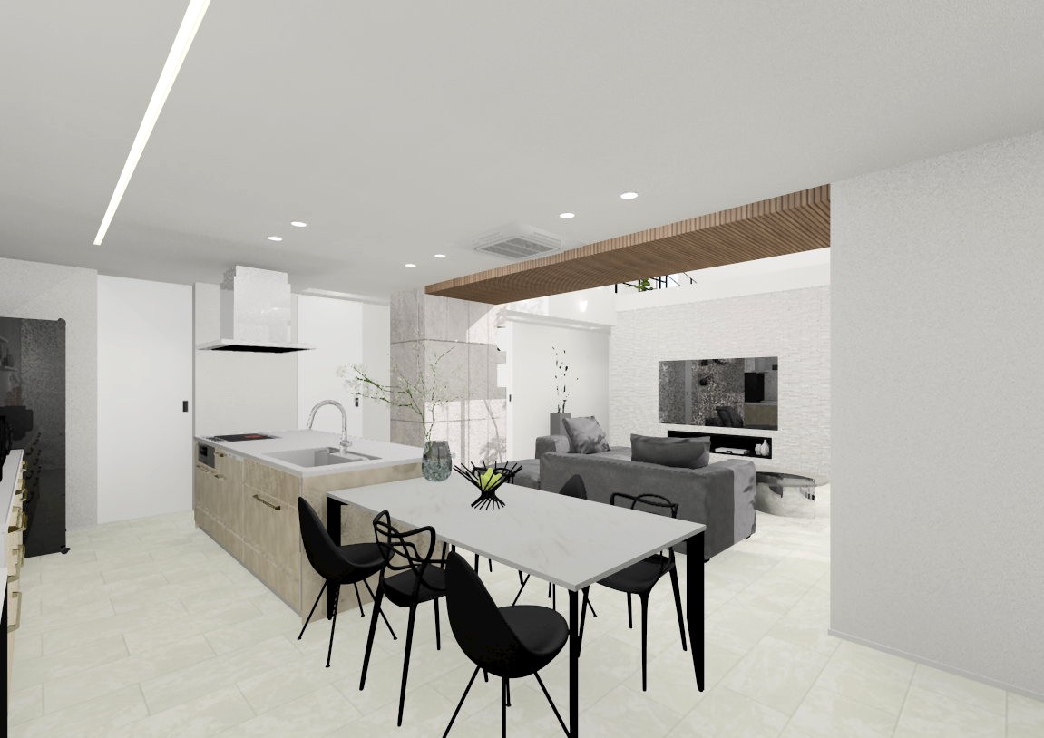内観は石目調のフローリングやクロスなどホワイトをベースにし、ウォールナットの色味やブラックを差し色で入れたホテルライクな空間にコーディネートしました。