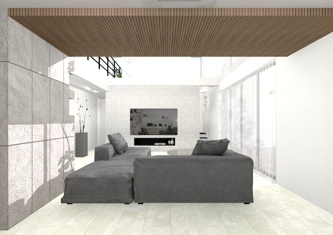 LDKのリブ材が目を引くアクセントになっており、自然と目線が上へと進み空間の広さ、高さを際立たせます。また、スキップフロアからはもちろん、2階から1階に降りる際や、外にいるときにもタイルデッキ越しに目に入るよう設計しました。