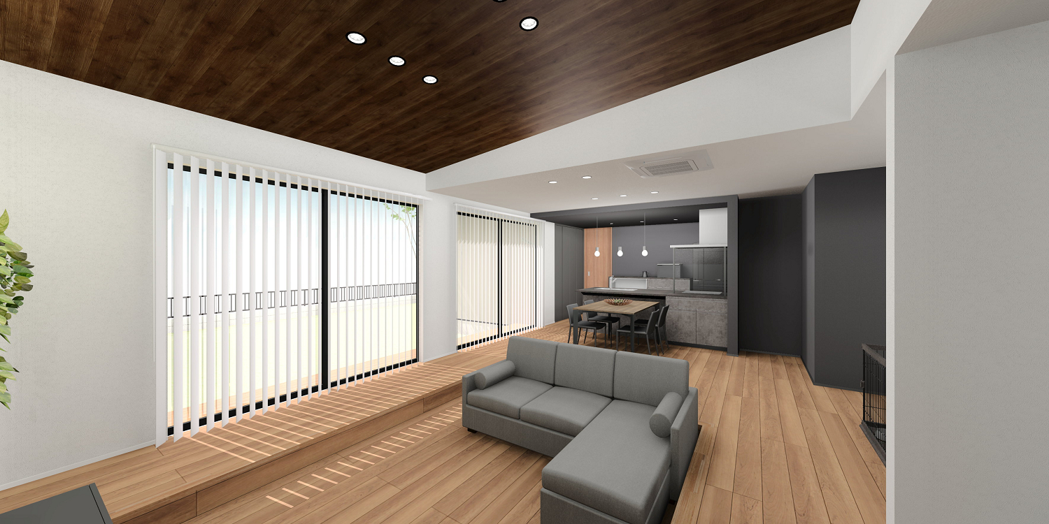 ダウンフロアや勾配天井など、空間を印象づける要素を随所に取り入れ、のびやかな広がりを感じられる住空間となっています。