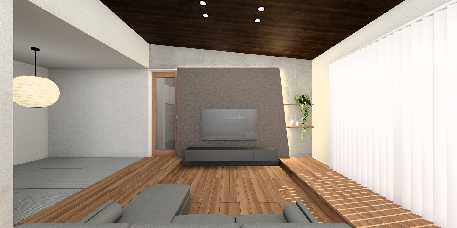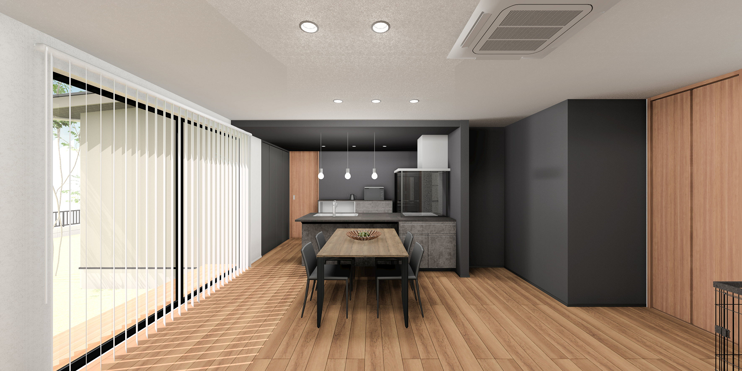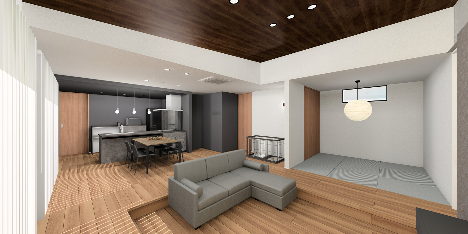 室内は、お施主様が希望された「LDKのどこかに目を惹くデザイン」を実現するため、素材感や照明計画を含めて丁寧にコーディネート。