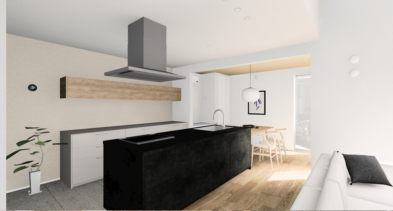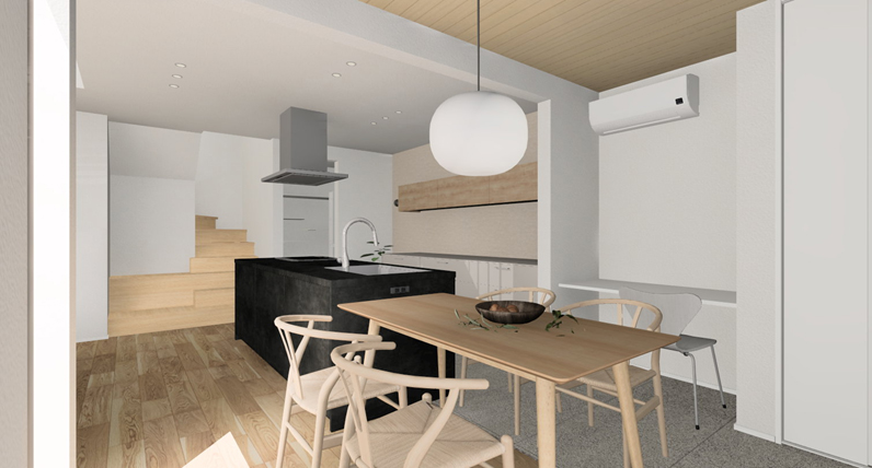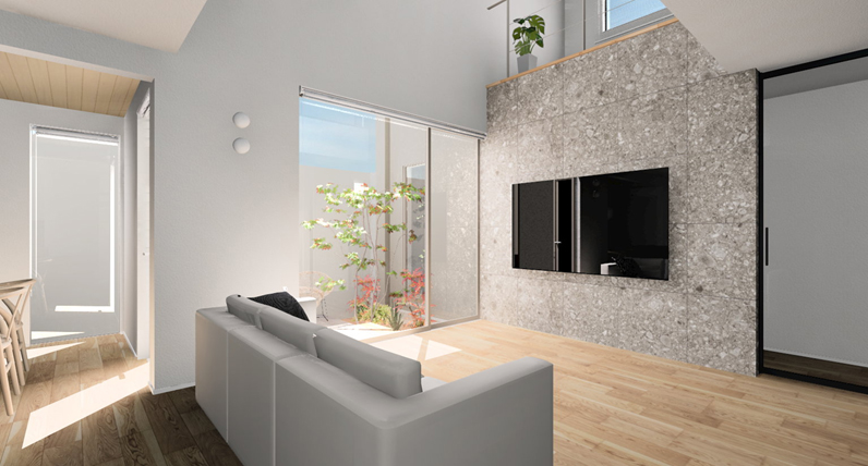 内部では、リビングのTV面と中庭に面した外壁を視覚的につなげることで、内と外がゆるやかにつながる、広がりのある空間を演出しています。
