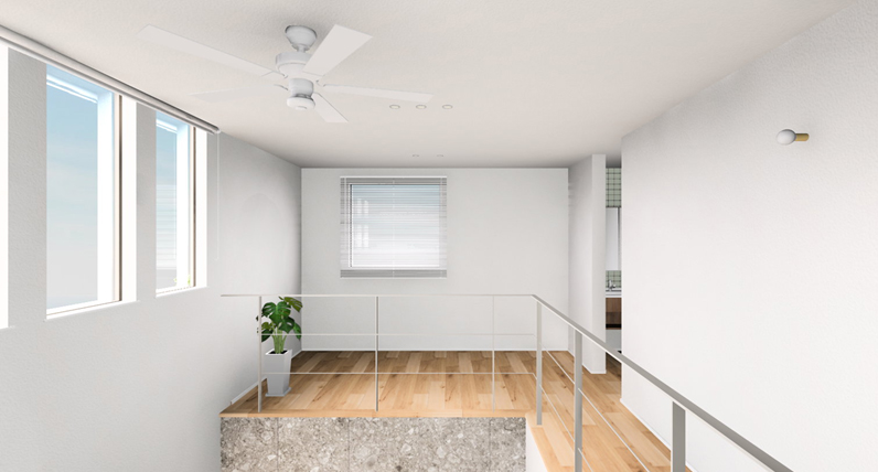 また、ソファに座ったときに吹き抜け越しの空が望めるよう窓の位置にもこだわり、日常の中で空や光を身近に感じられる住まいとしました。
