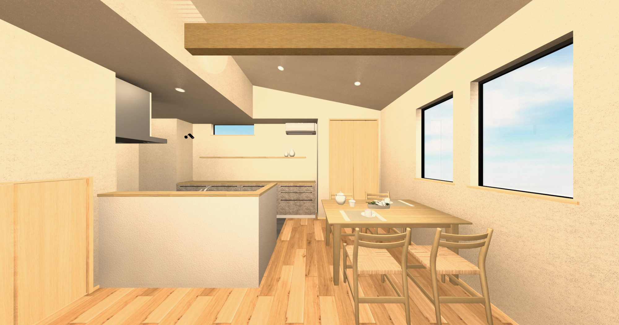 LDKには勾配天井を採用し、実際の帖数以上の広がりと開放感を演出。