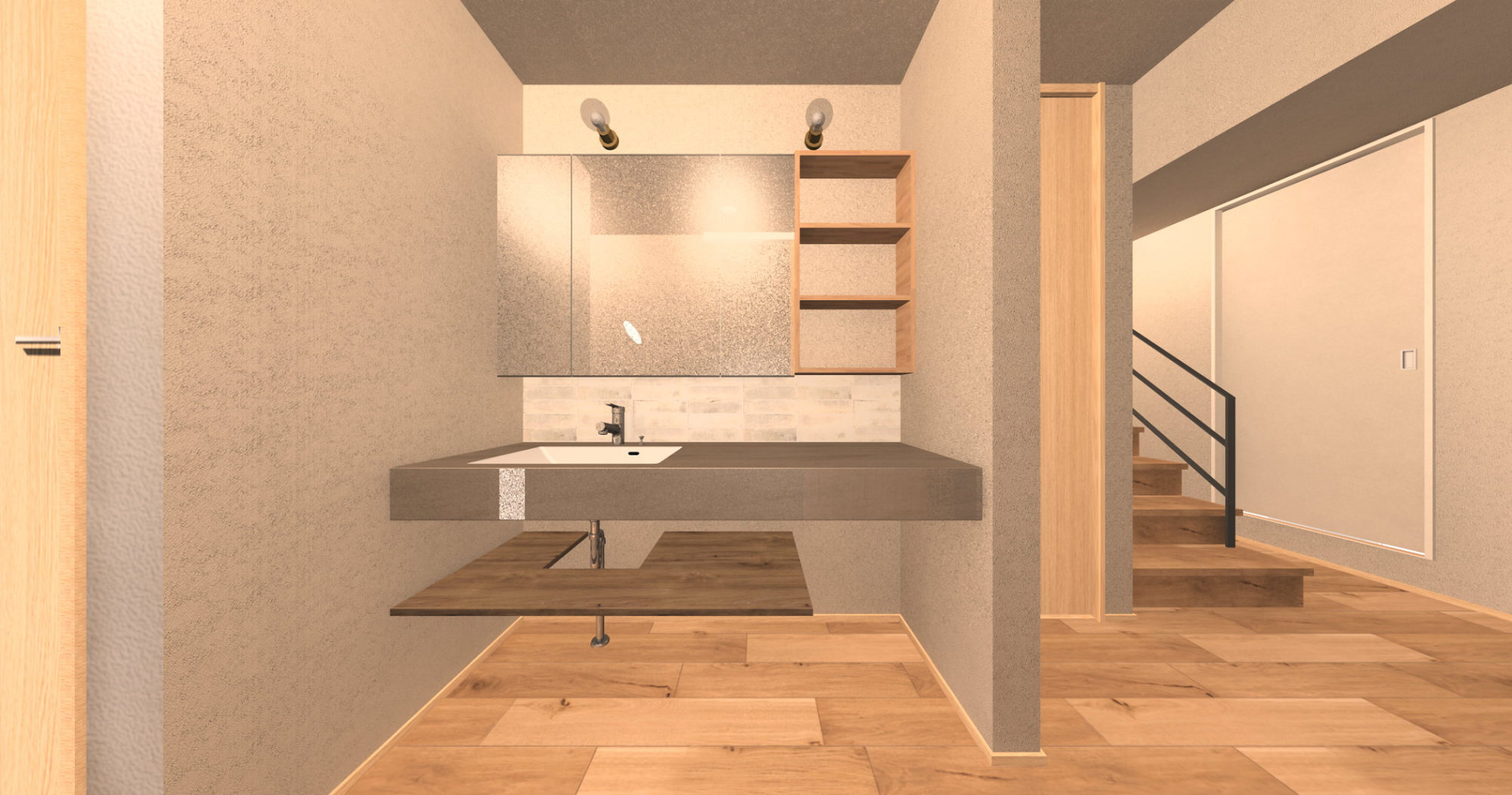木の温もりを基調に、洗面台のタイルや玄関のペンダントライトなど、随所に和の要素を取り入れた、シンプルでありながらも落ち着きと温かみを感じる大人な空間にコーディネート。
