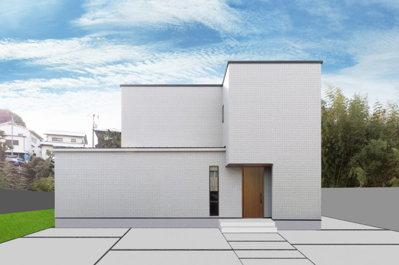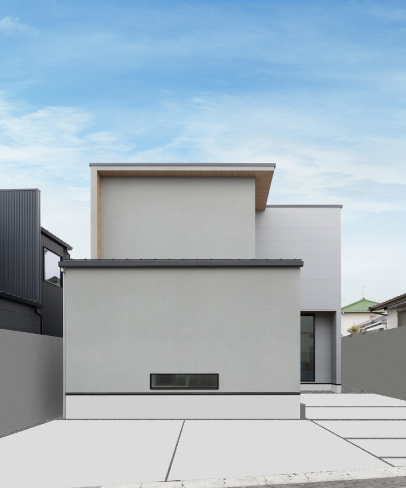 手前に外構としてガレージが配置されることを想定し、ガレージを目隠しとして活かしながら、中庭のように使える空間構成としています。建物上部や玄関部分には凹凸を設け、ガレージがあっても印象的に映るデザインとしました。
