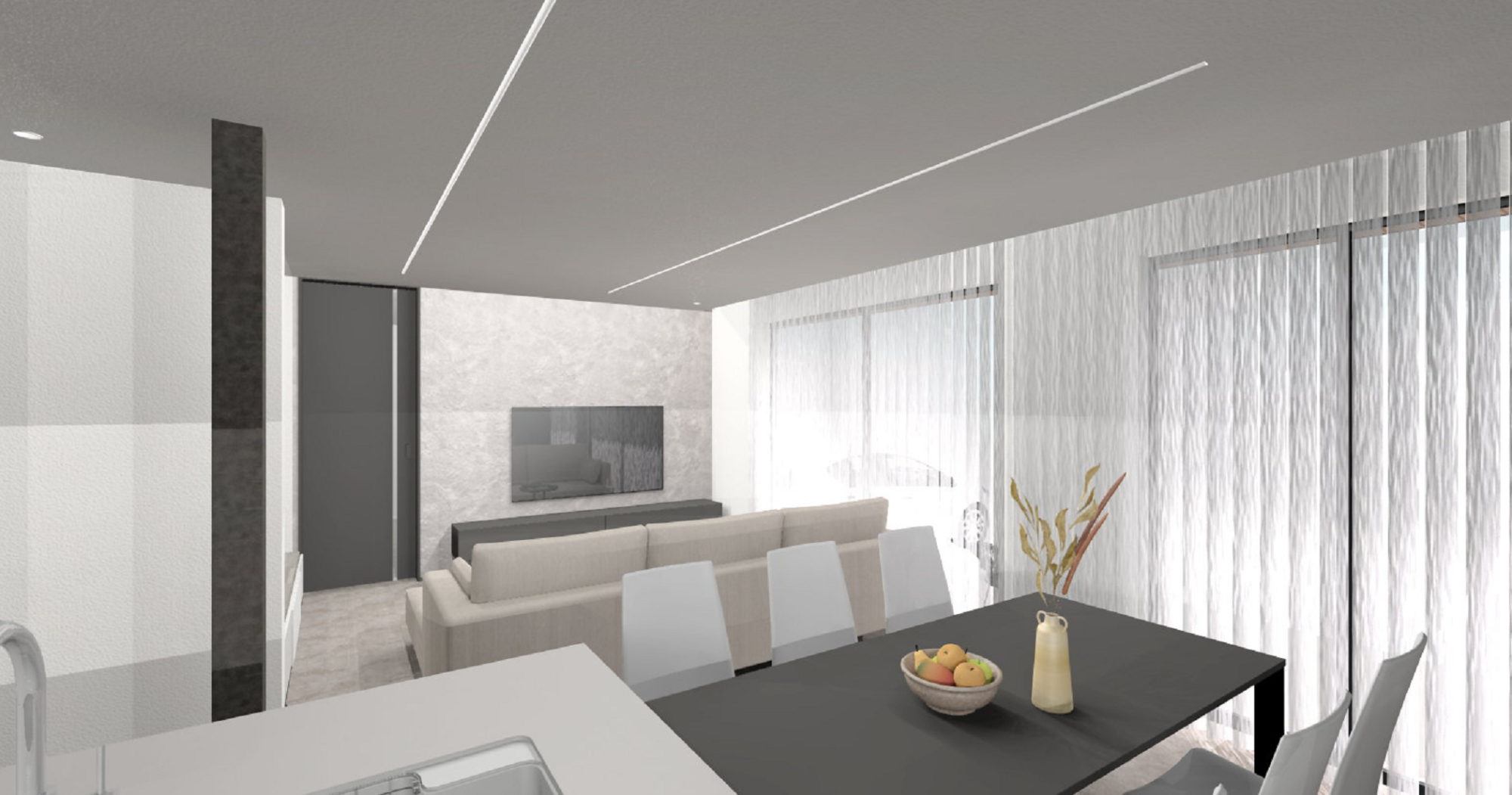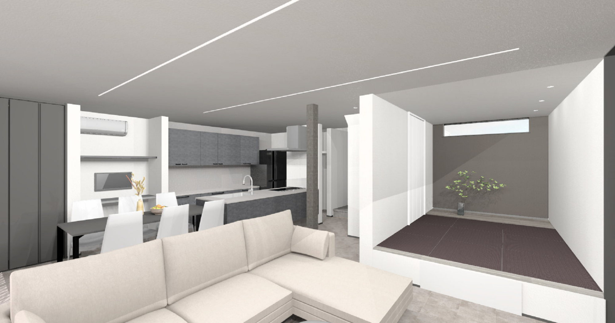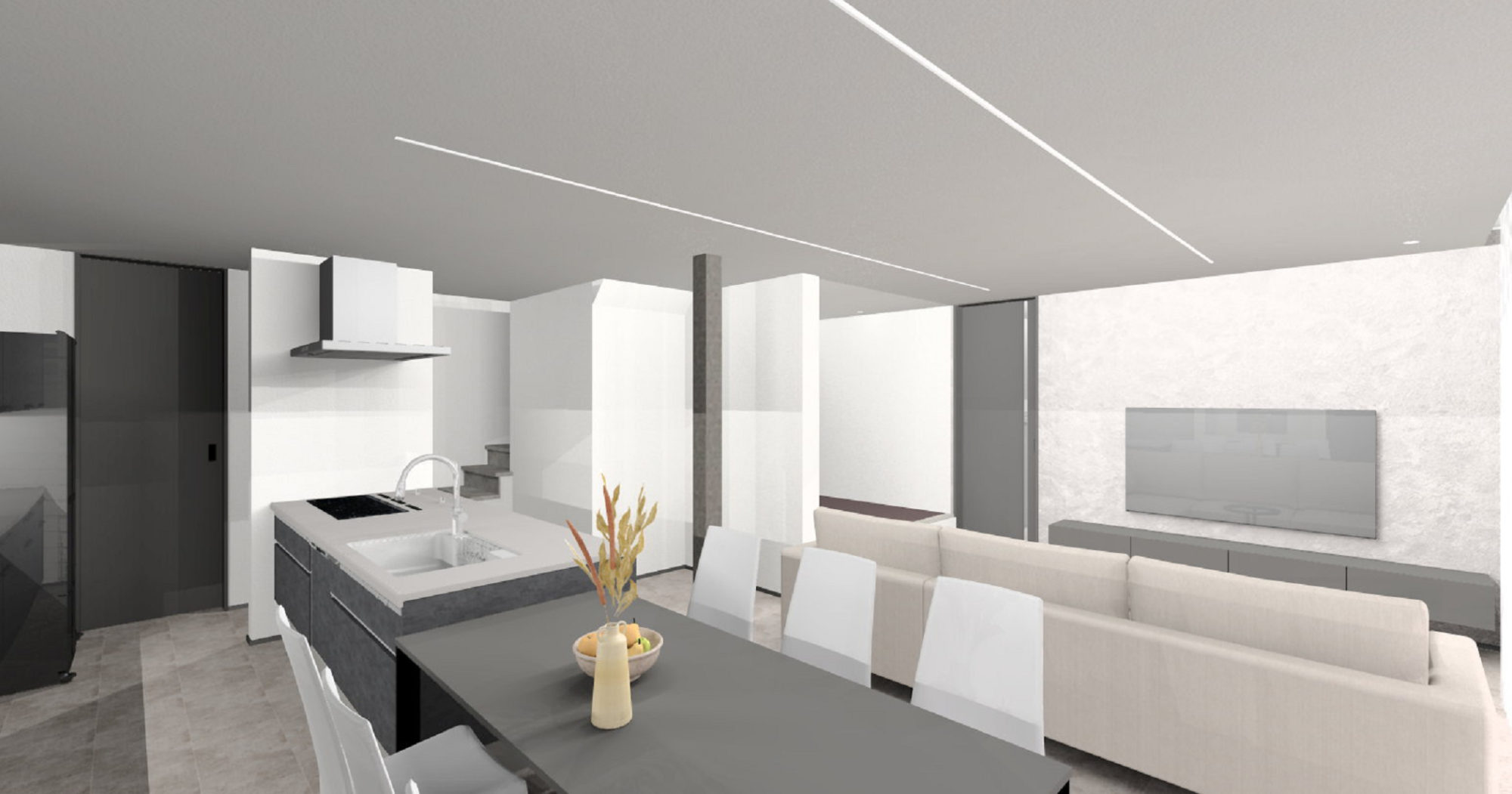 室内は、天井をすっきりと見せたいというご要望から、リビングに埋め込みタイプのライン照明を採用。