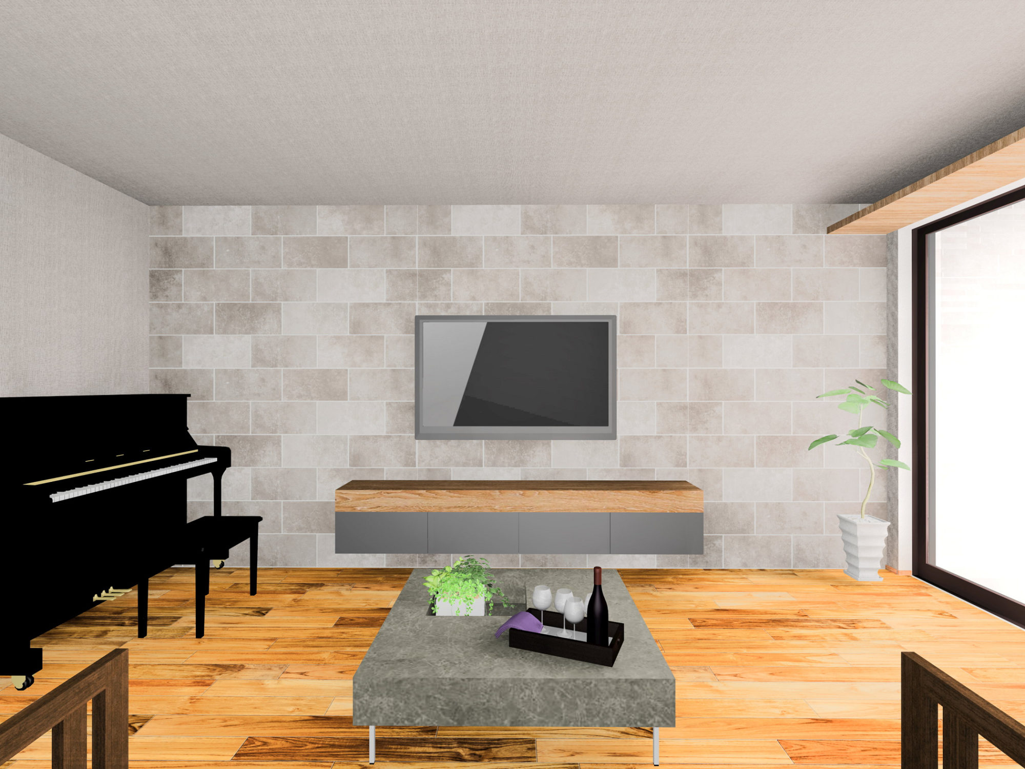 TV背面のタイルをバルコニーまでつなげることで、視線が自然と外へ抜け、より心地よい開放感を味わえる空間となりました。