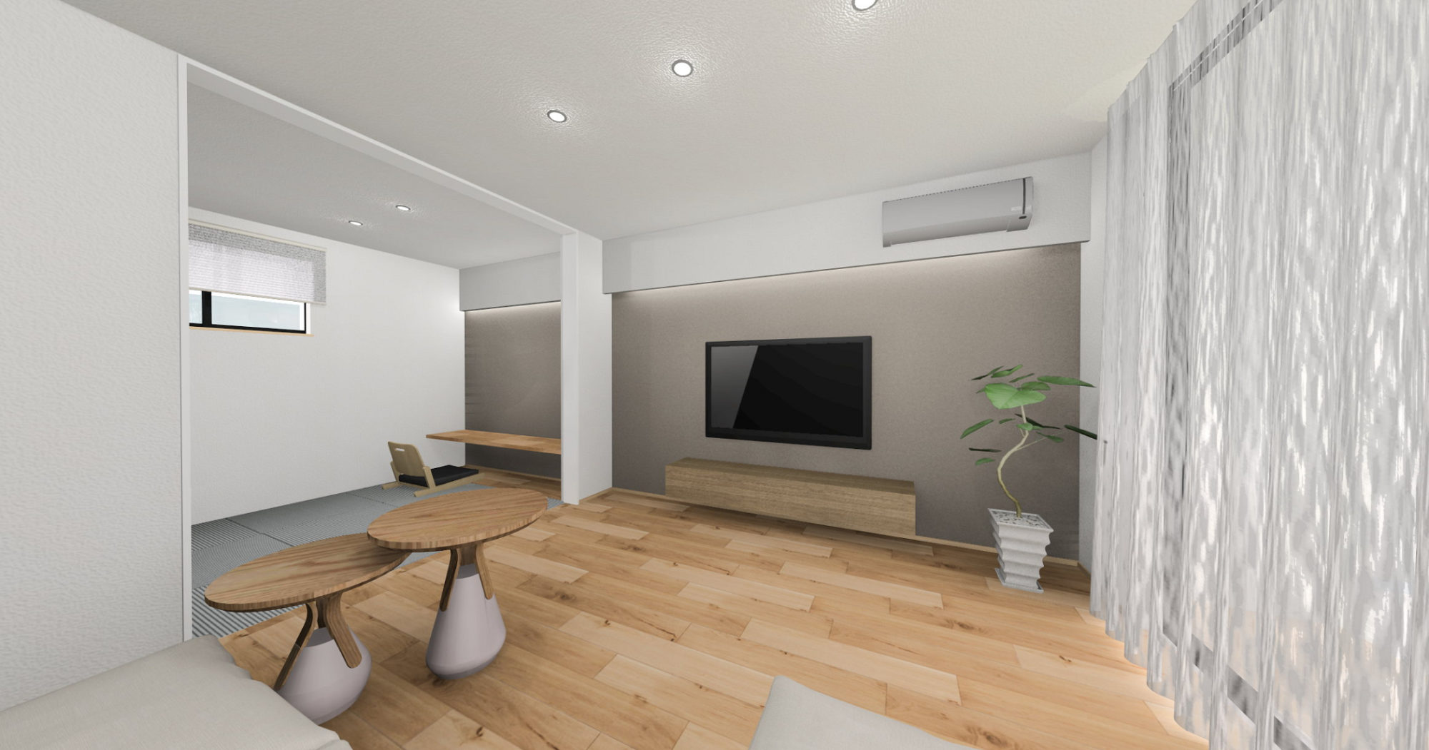 LDKと隣接する和室は、基本的に扉を開けて広く使いたいというご要望を受け、和室とLDKのTV面を同一デザインとすることで、空間に連続性をもたせました。視覚的な広がりを感じられる、開放的な空間に仕上げています。