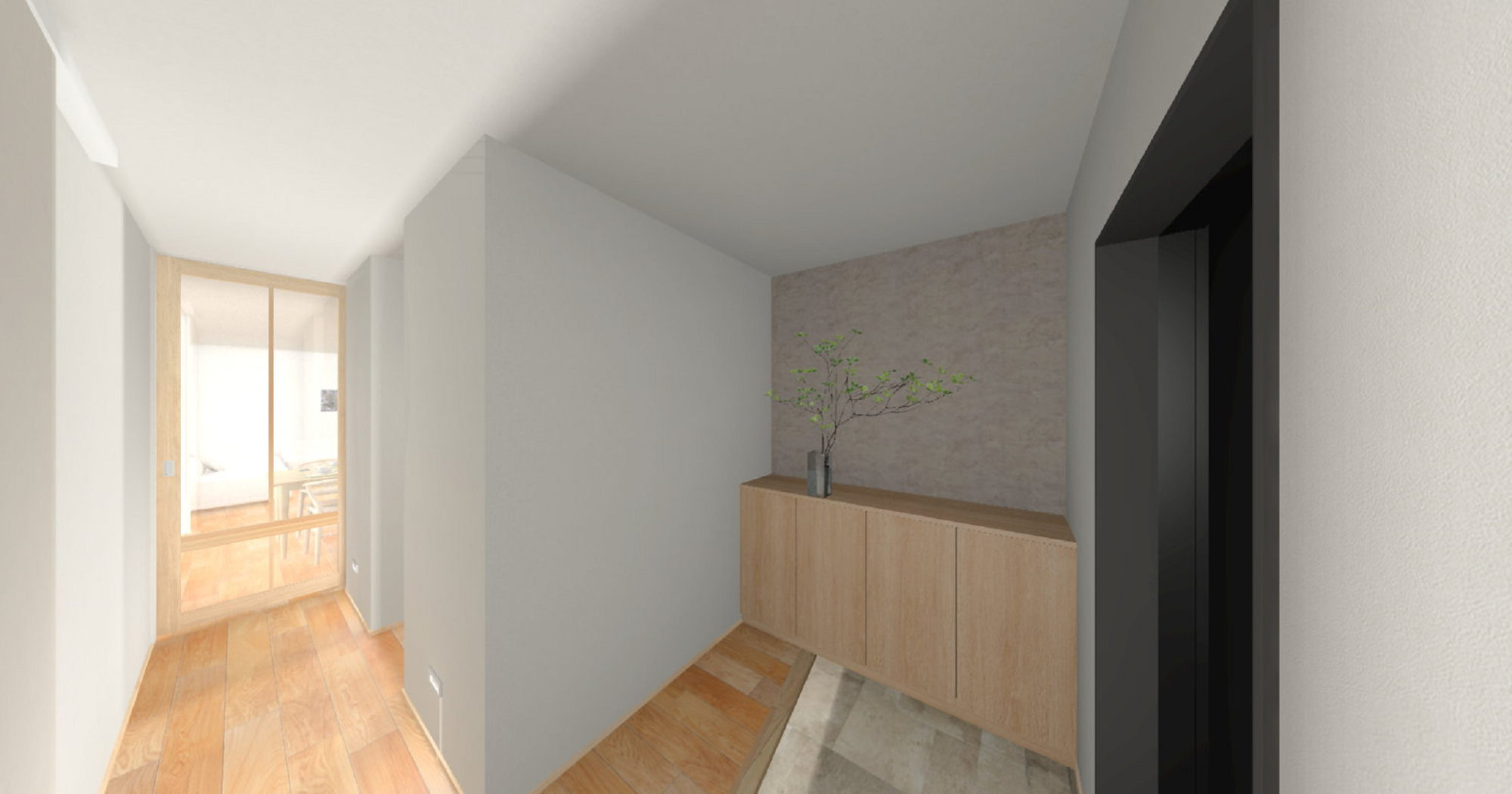 玄関ホールに入ると、チラリと見えるこだわりの造作洗面と、造作ガラスドア越しにのぞくLDKが期待感を高めます。