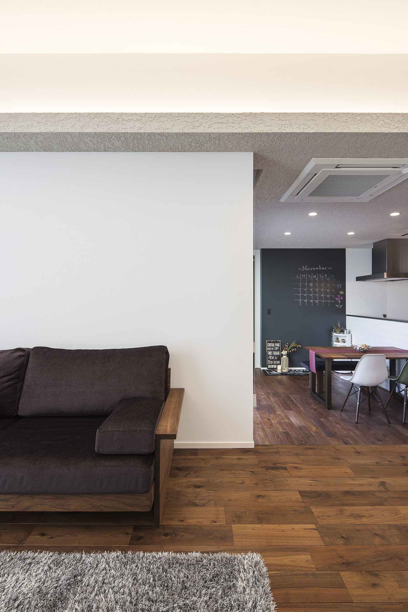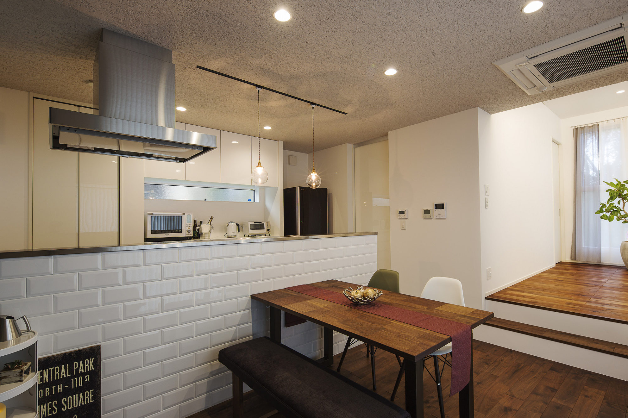 ダイニングとリビングとの間に設けられた段差が空間にリズムを生む室内。
