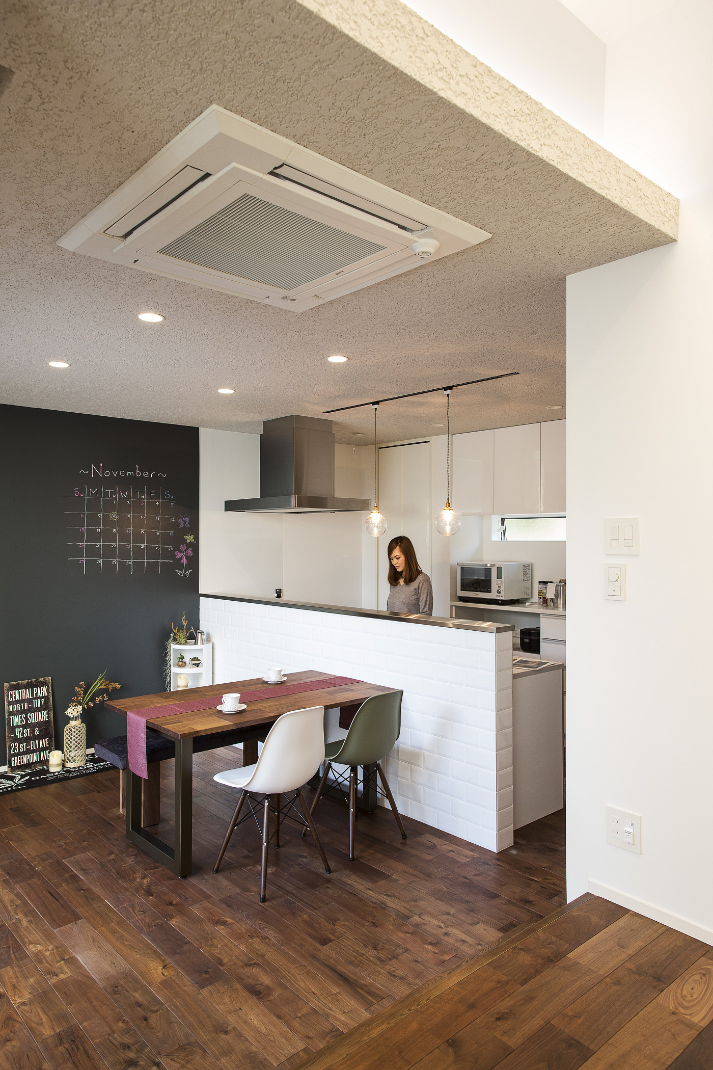 ダイニング奥の壁は黒板塗装されていて、キッチンで作業しながらお子さんのお絵かきを見守ることができる。