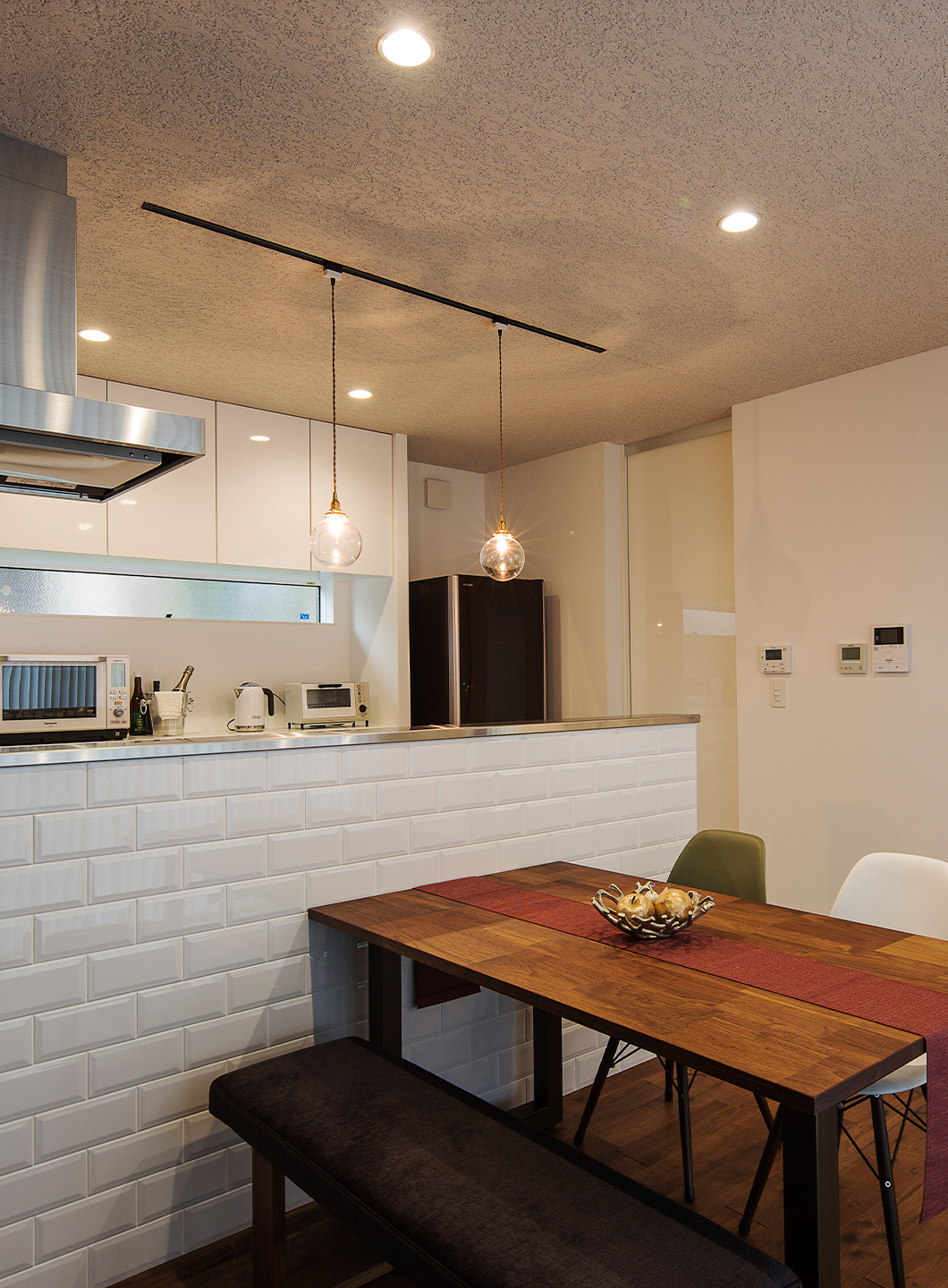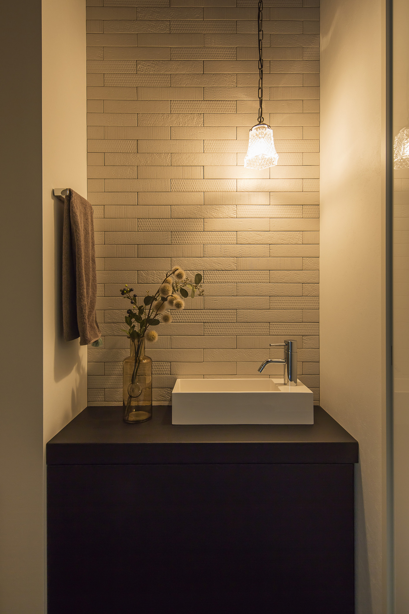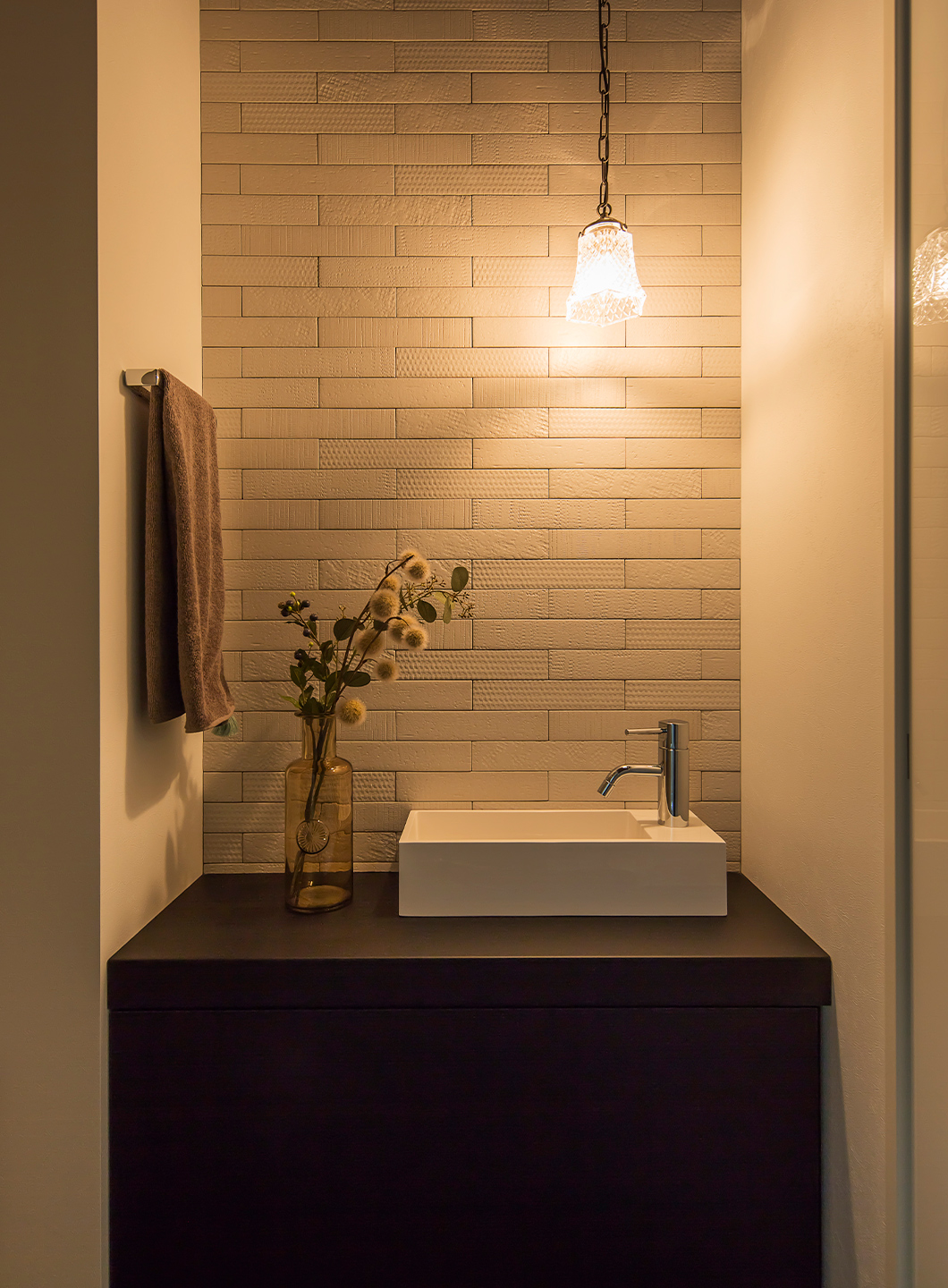 玄関ホール横の手洗いコーナーは、アンティーク調のペンダントライトが白いタイルをやさしく照らす落ち着いた空間に。