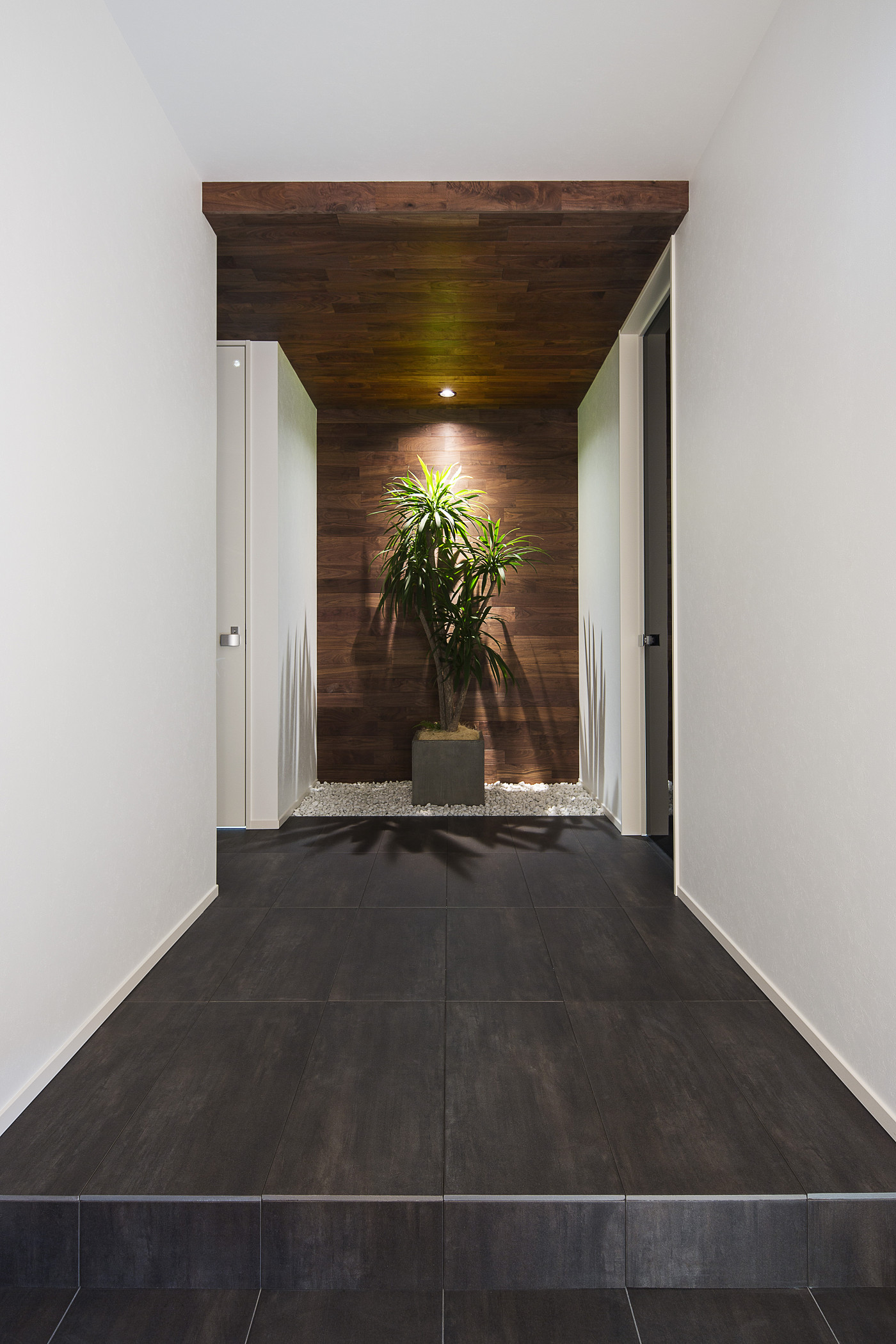 黒タイルの床の先にライトアップされたグリーンが迎える印象的な玄関。下がり天井にはウォルナットを貼り、重厚な迎賓空間に。