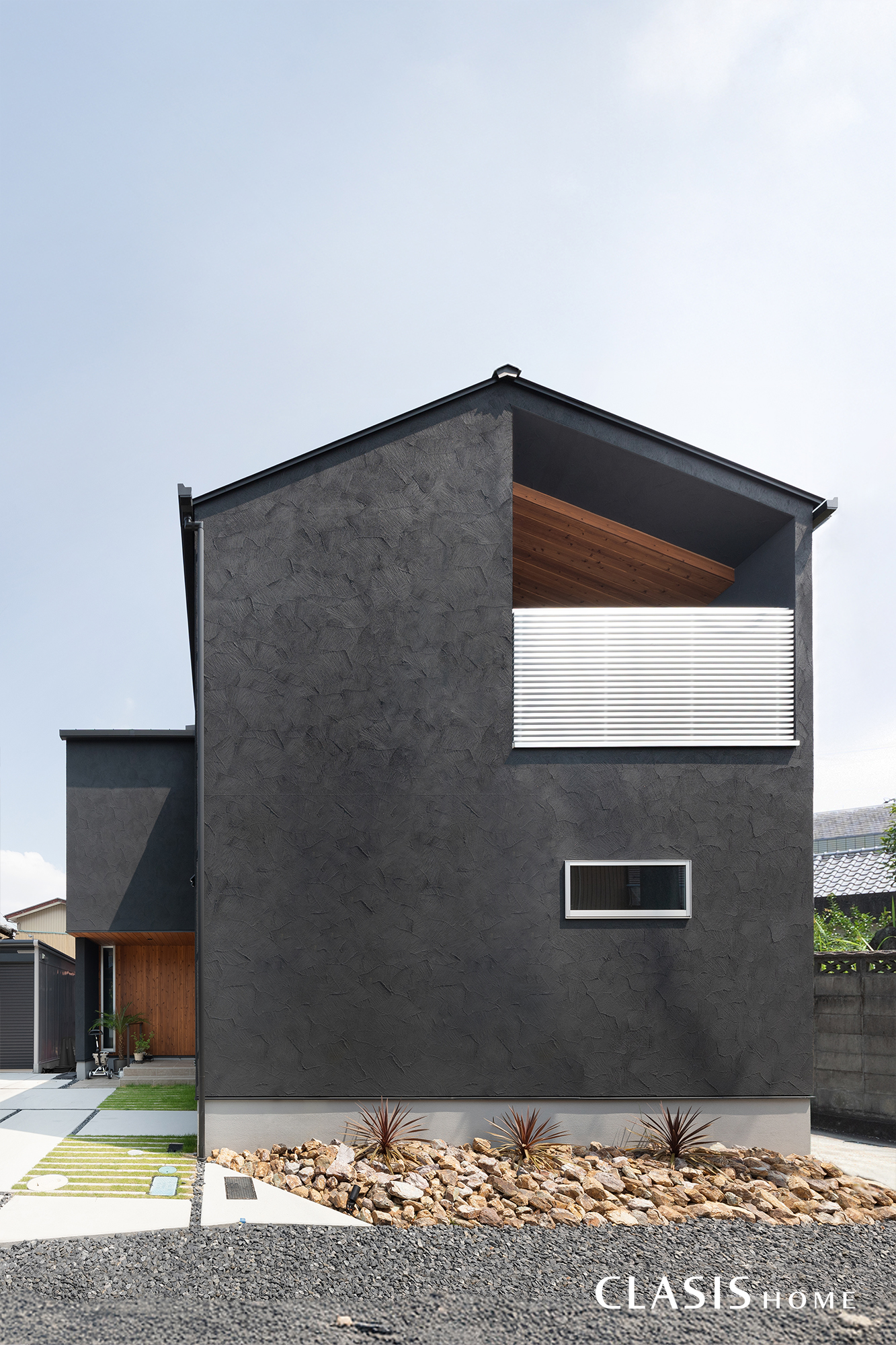 質感・素材感にこだわり、黒の塗り壁を基調に、玄関周りは天然木をあしらいました。