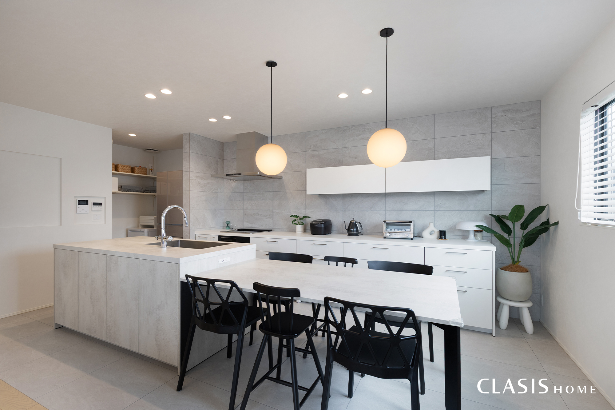 淡い色合いで爽やかにまとめたキッチン。ブラックをアクセントカラーにして、空間をグッと引き締めています。