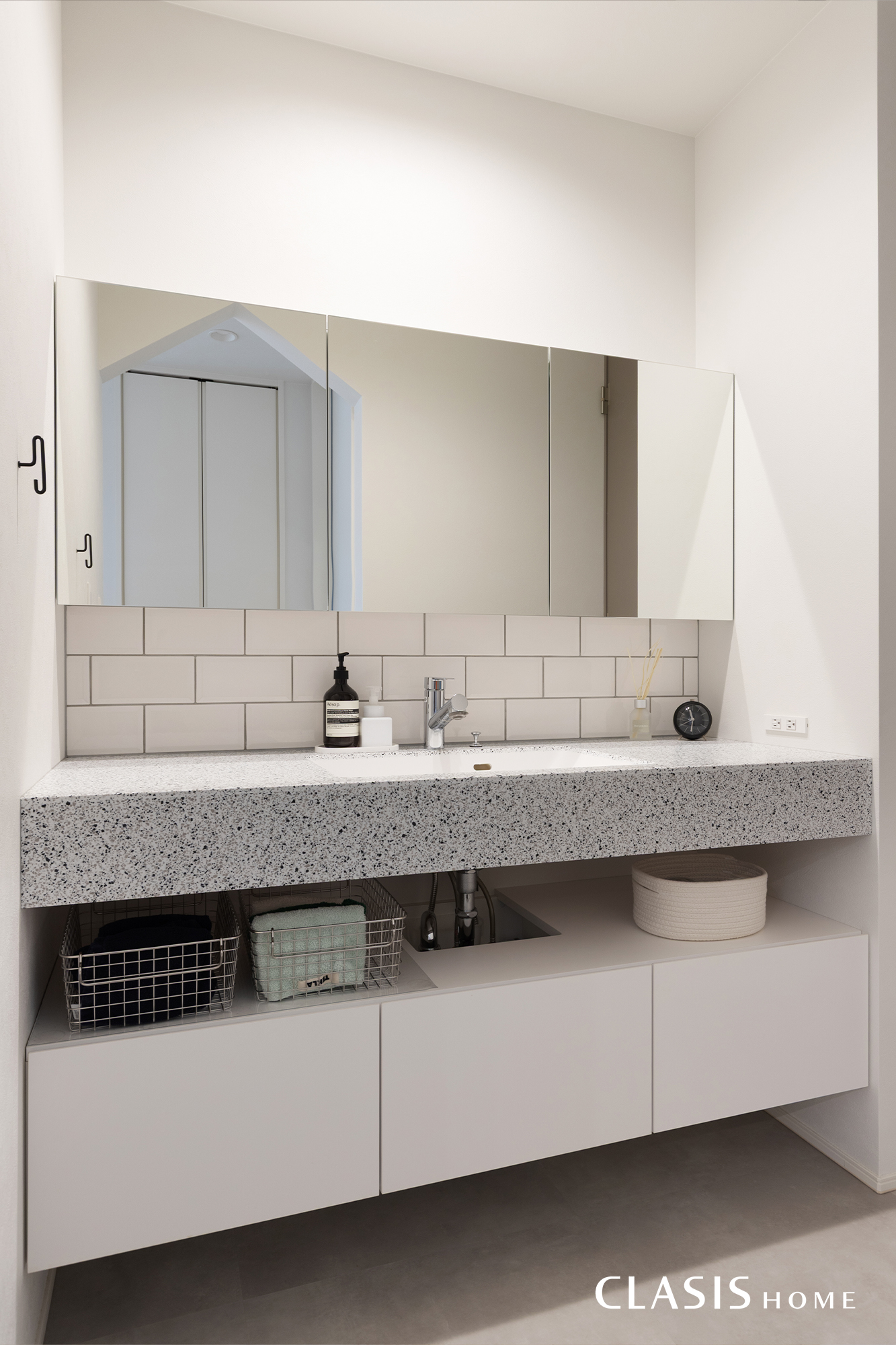 テラゾー柄のカウンターを用いた造作洗面台。サブウェイタイルや白の造作収納がマッチして爽やかな雰囲気にまとめました。
