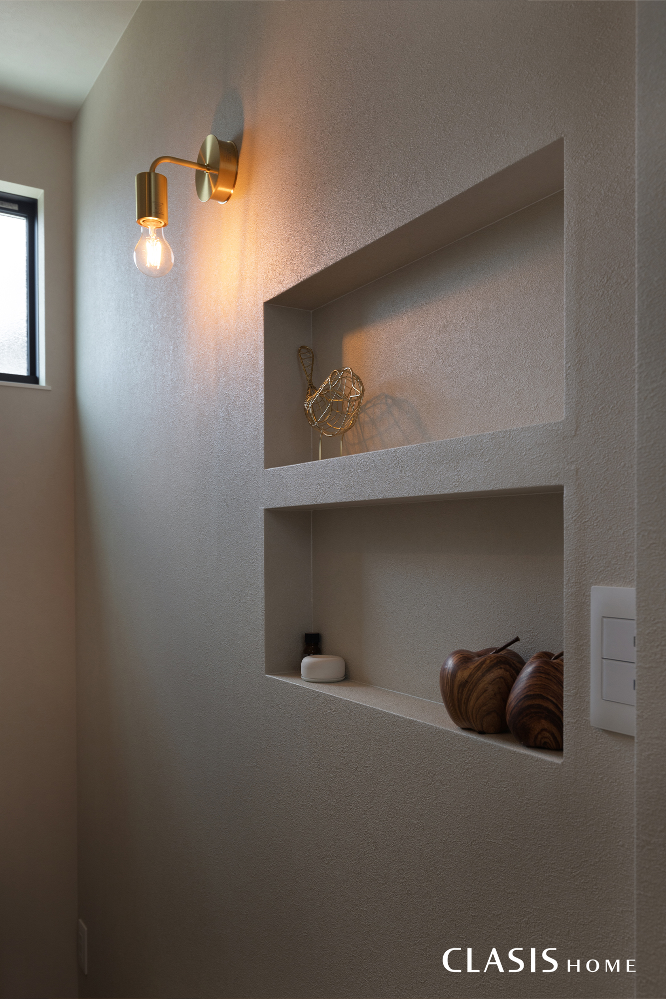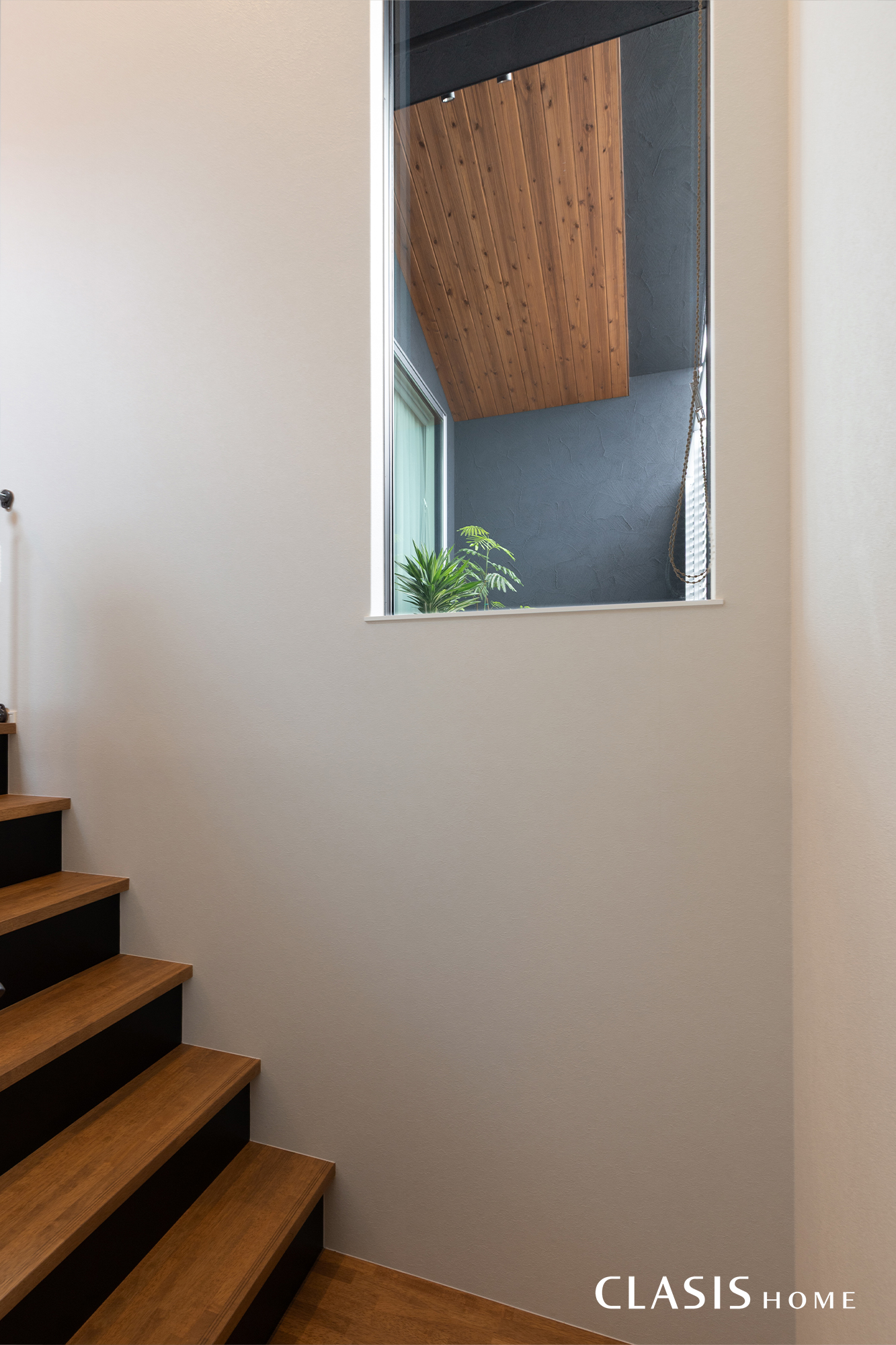階段スペースは2階のバルコニー天井の木目が窓越しに覗きます。ブラケット照明やニッチも設け、ディスプレイにもこだわりました。