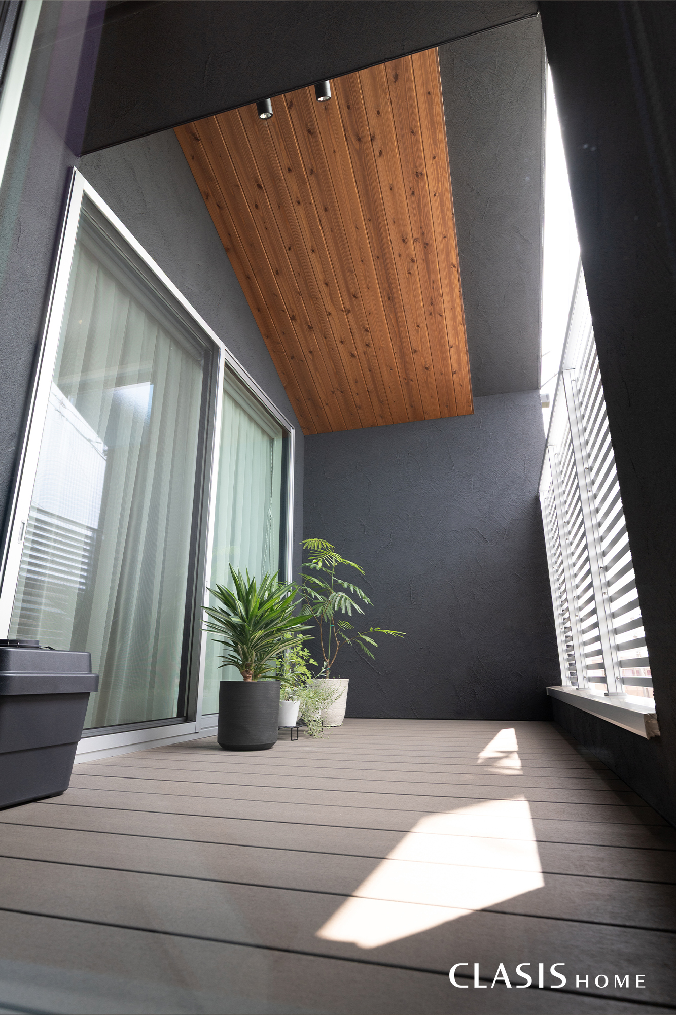 バルコニーは天井に玄関周りと同じ木目をあしらいました。バルコニーとLDKの段差を解消するため、床上に樹脂デッキを採用しています。