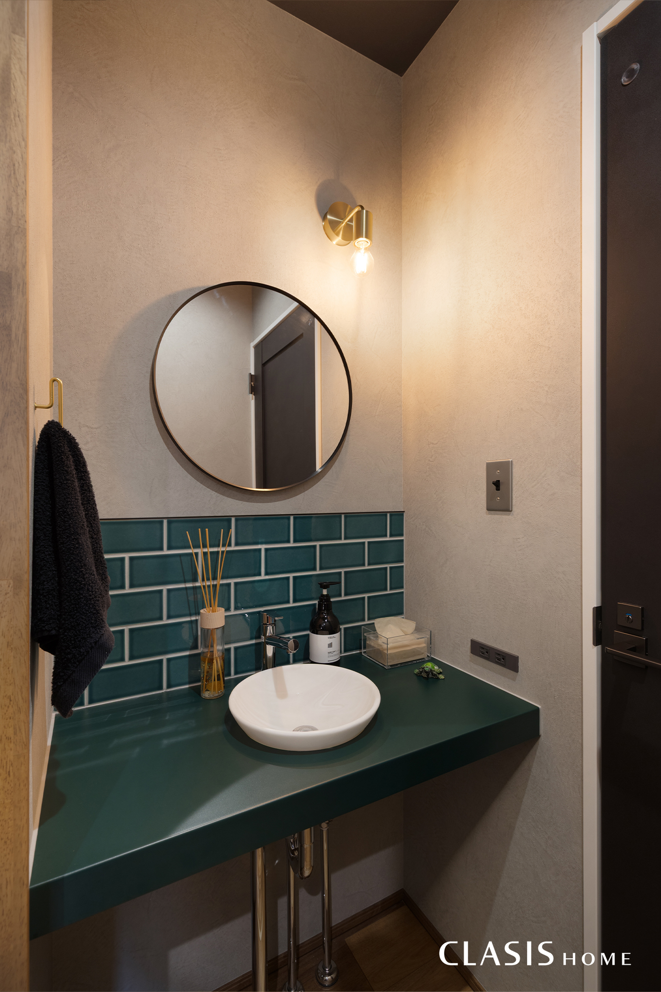 玄関ホール横の手洗い。「緑色が好きでどこかに採用したい」という話も打ち合わせ時にしていただいており、玄関ホールのアクセントにもなる手洗器のカウンターとタイルに緑を取り入れました。