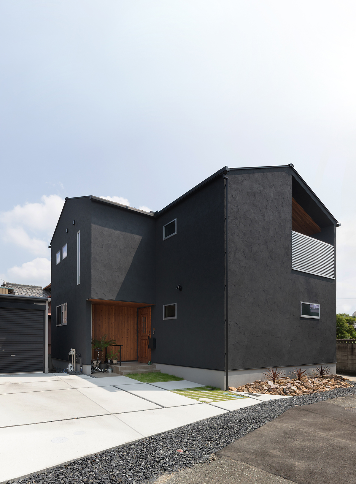 質感・素材感にこだわり、黒の塗り壁を基調に、玄関周りは天然木をあしらいました。