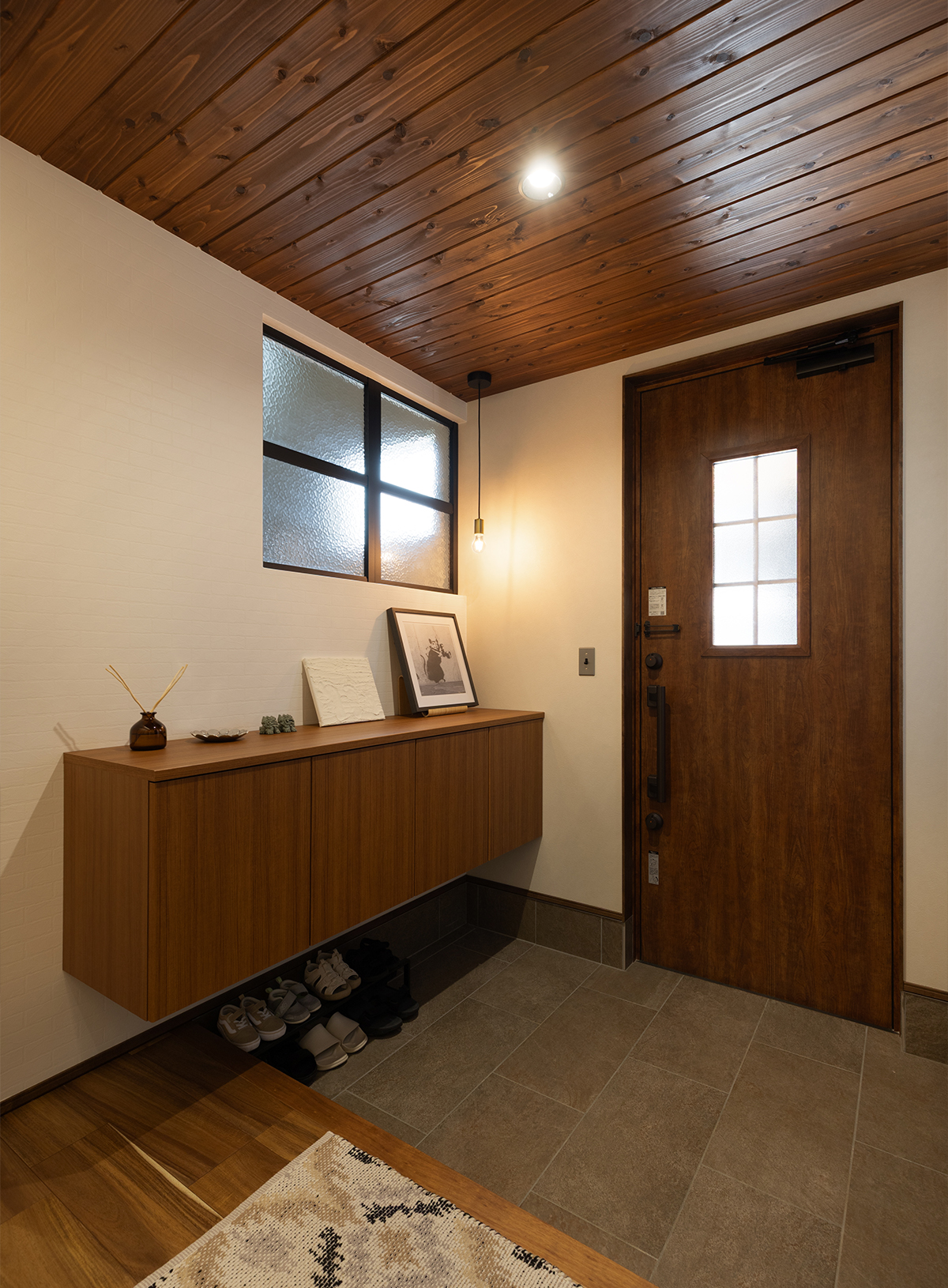 玄関ホールにもポーチと同じ杉板を天井に用いて、世界観をリンクさせています。床材にはアカシアの突板を採用して、味わい深いナチュラルな印象を持たせました。