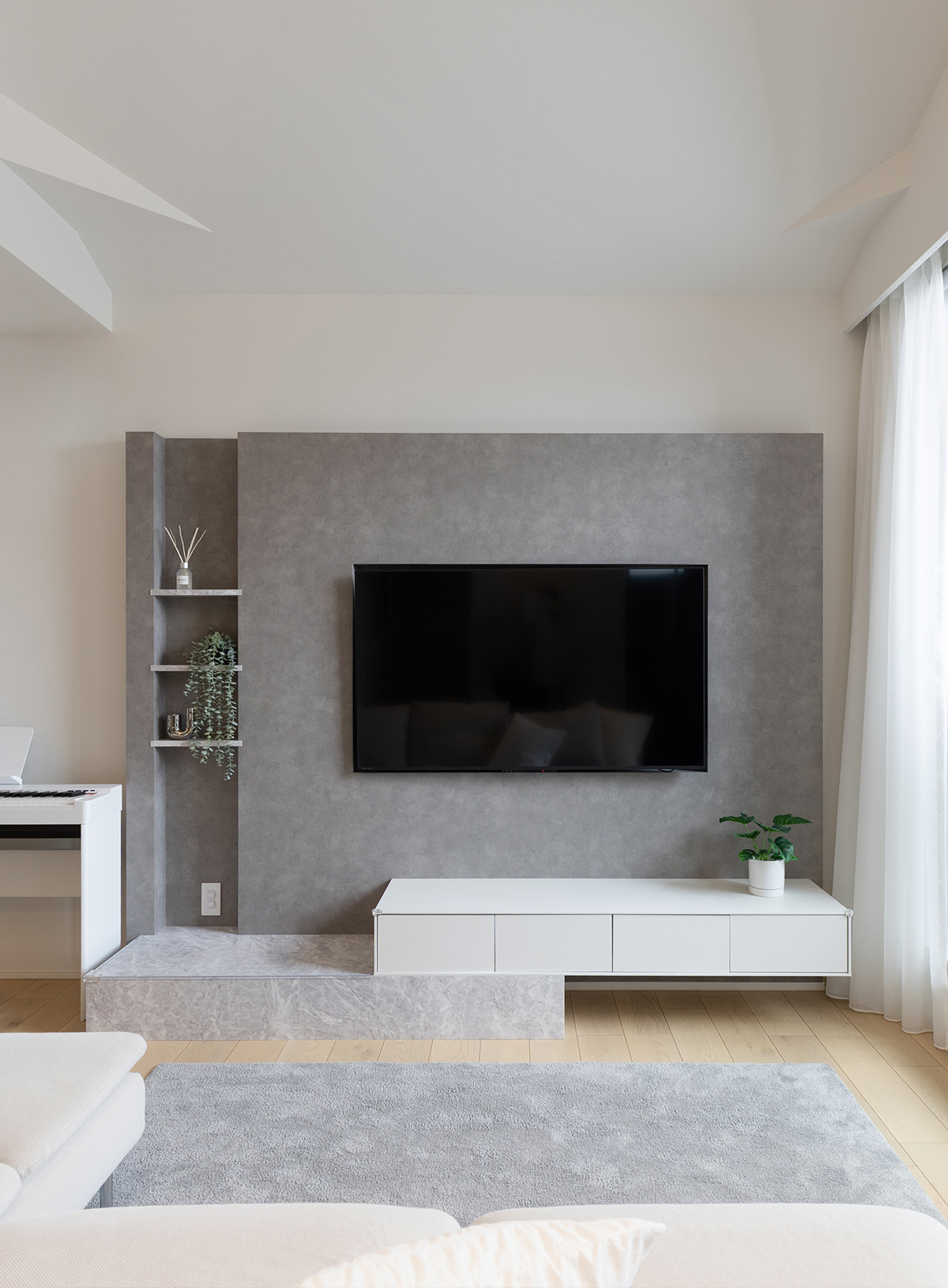 リビングのテレビ面のふかし壁や飾り棚、収納など、デザインにこだわって造作しました。リゾート系のイメージも出したいとの話があり、全体的に白色を多く採用しています。