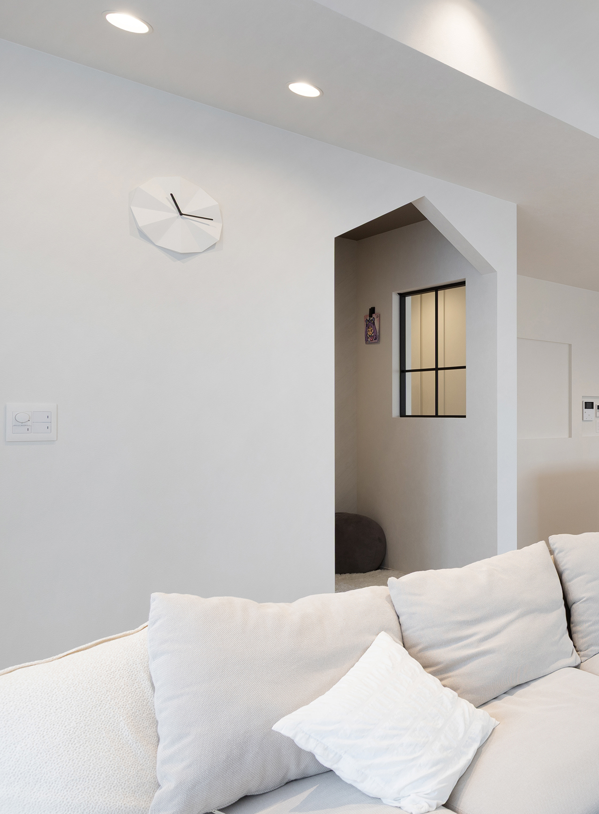 LDKには三角の垂れ壁の奥にヌックを設けています。チラリと覗く室内窓がポイント。
