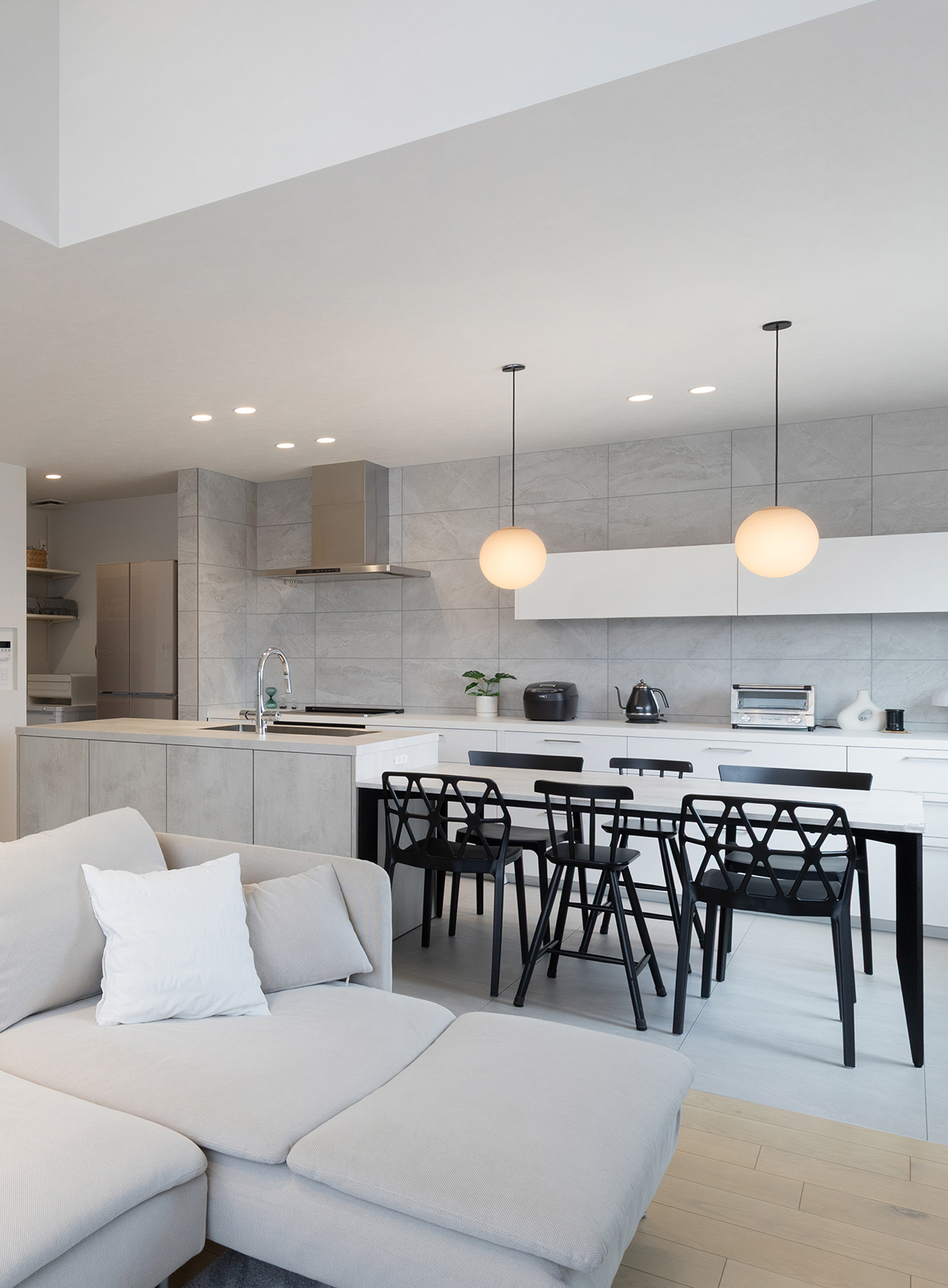 淡い色合いで爽やかにまとめたキッチン。ブラックをアクセントカラーにして、空間をグッと引き締めています。