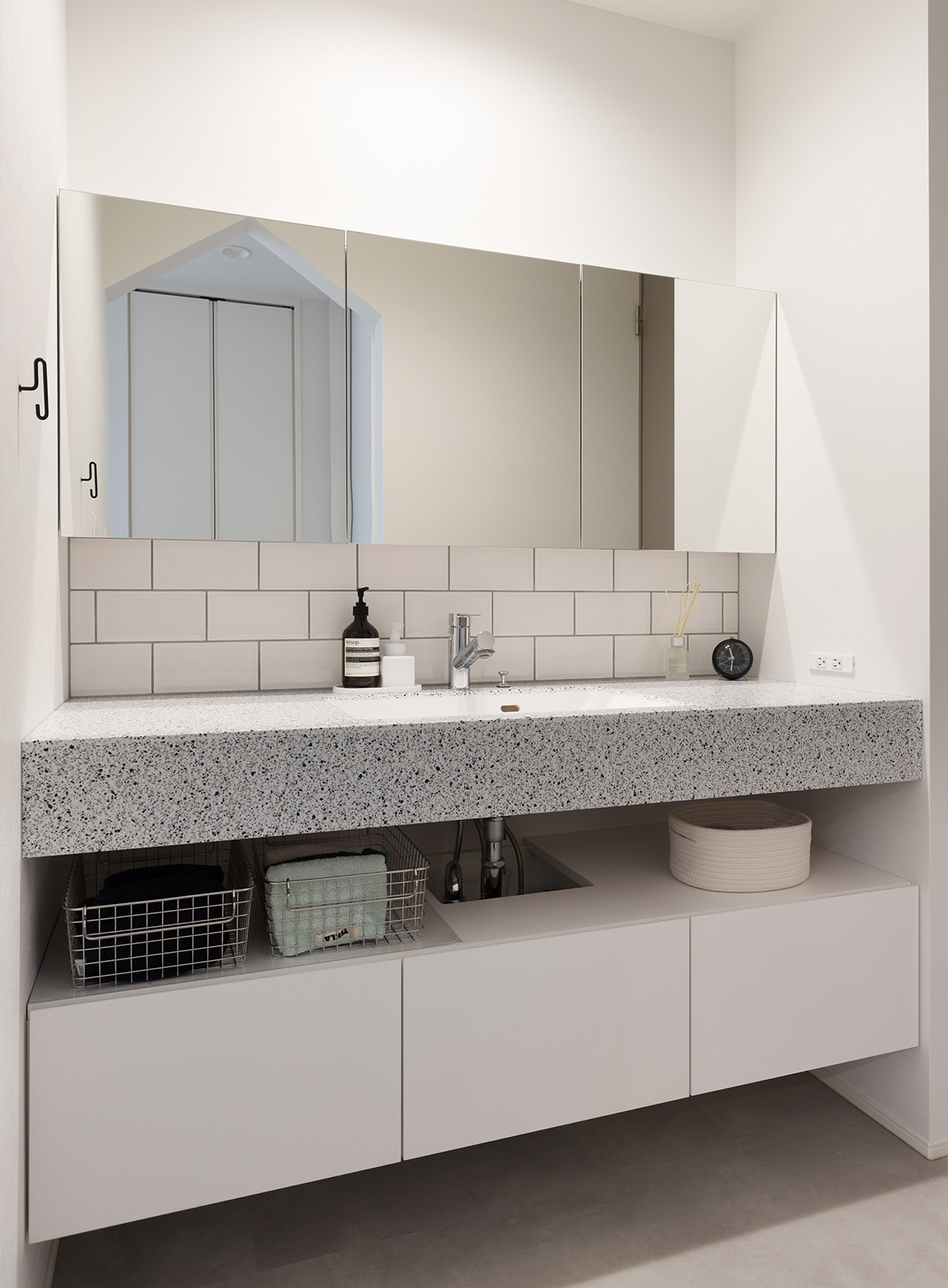 テラゾー柄のカウンターを用いた造作洗面台。サブウェイタイルや白の造作収納がマッチして爽やかな雰囲気にまとめました。