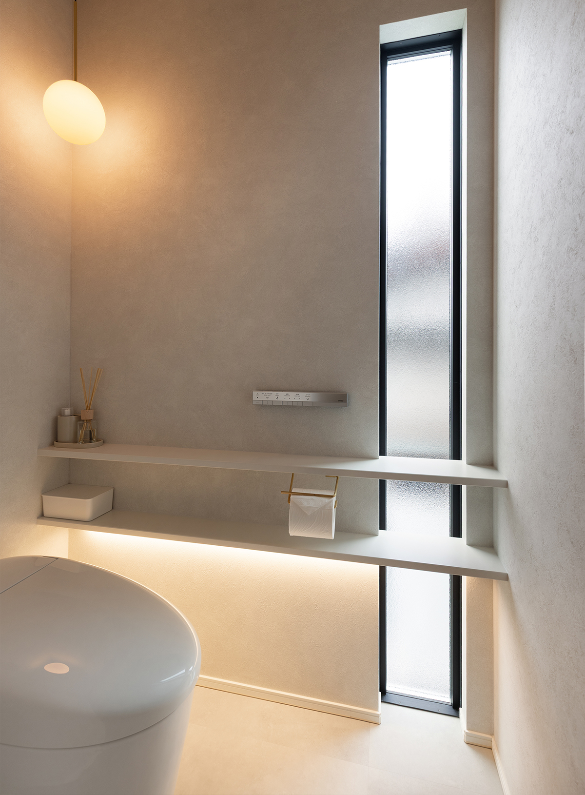 淡い色合いでまとめたトイレ。縦長のスリット窓からしっかり光が入るため、昼間はライト無しでも明るいトイレになりました。