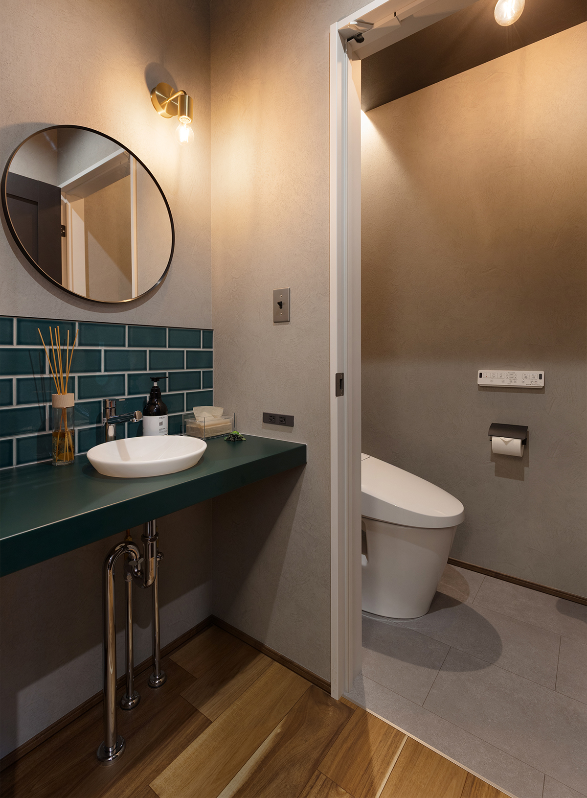 玄関ホール横の手洗い。「緑色が好きでどこかに採用したい」という話も打ち合わせ時にしていただいており、玄関ホールのアクセントにもなる手洗器のカウンターとタイルに緑を取り入れました。
