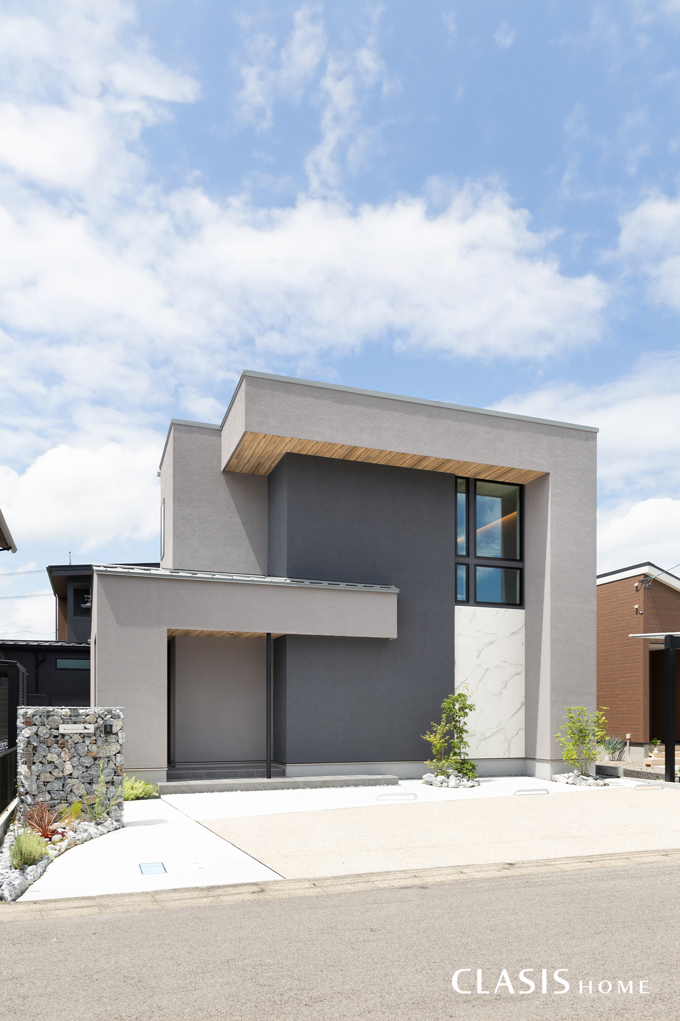 外壁材の貼り分けとフレームラインで凹凸感を強調したモダンな外観。2色のグレーの塗り壁を基調に、木目や大理石調タイルで素材感とメリハリを加えています。玄関先の鉄柱は、もともとお施主様に具体的なイメ―ジがあり、何度も打合せをした上でバランスを調整しました。