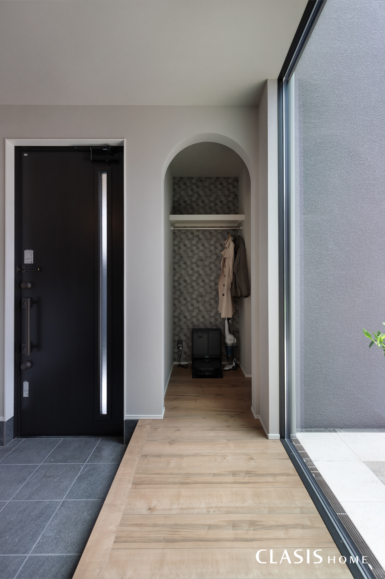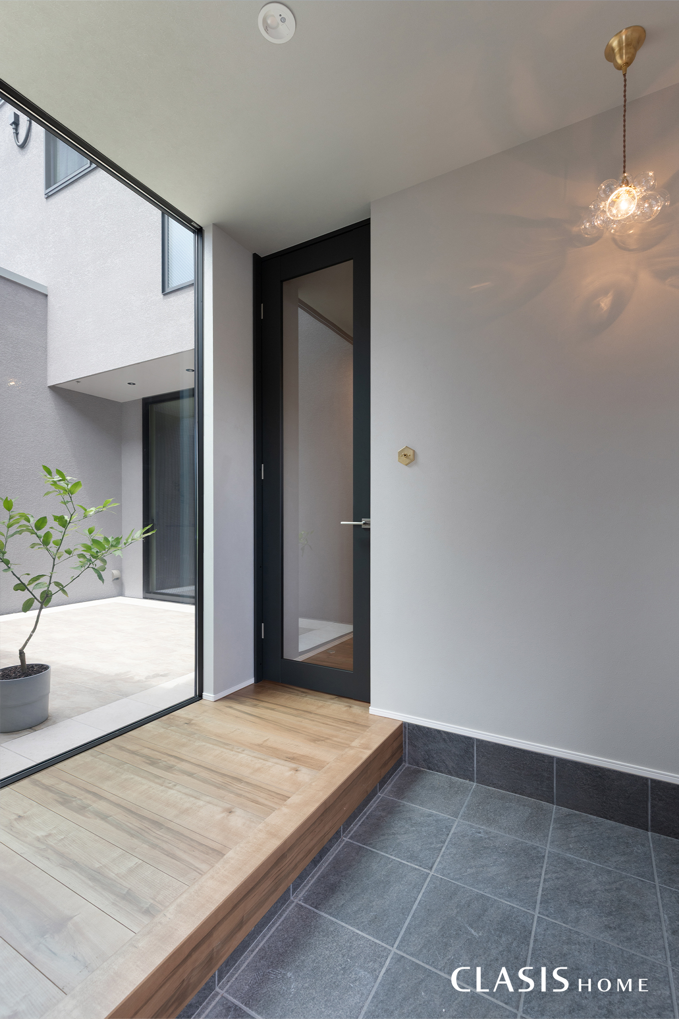 天井まで大きく設けた窓から眼前に中庭が広がる開放的な玄関ホール。目隠しの必要が無いプライベートな中庭のため、周囲からの視線を気にすることなく光を取り込み、のびやかに家族を迎える空間です。