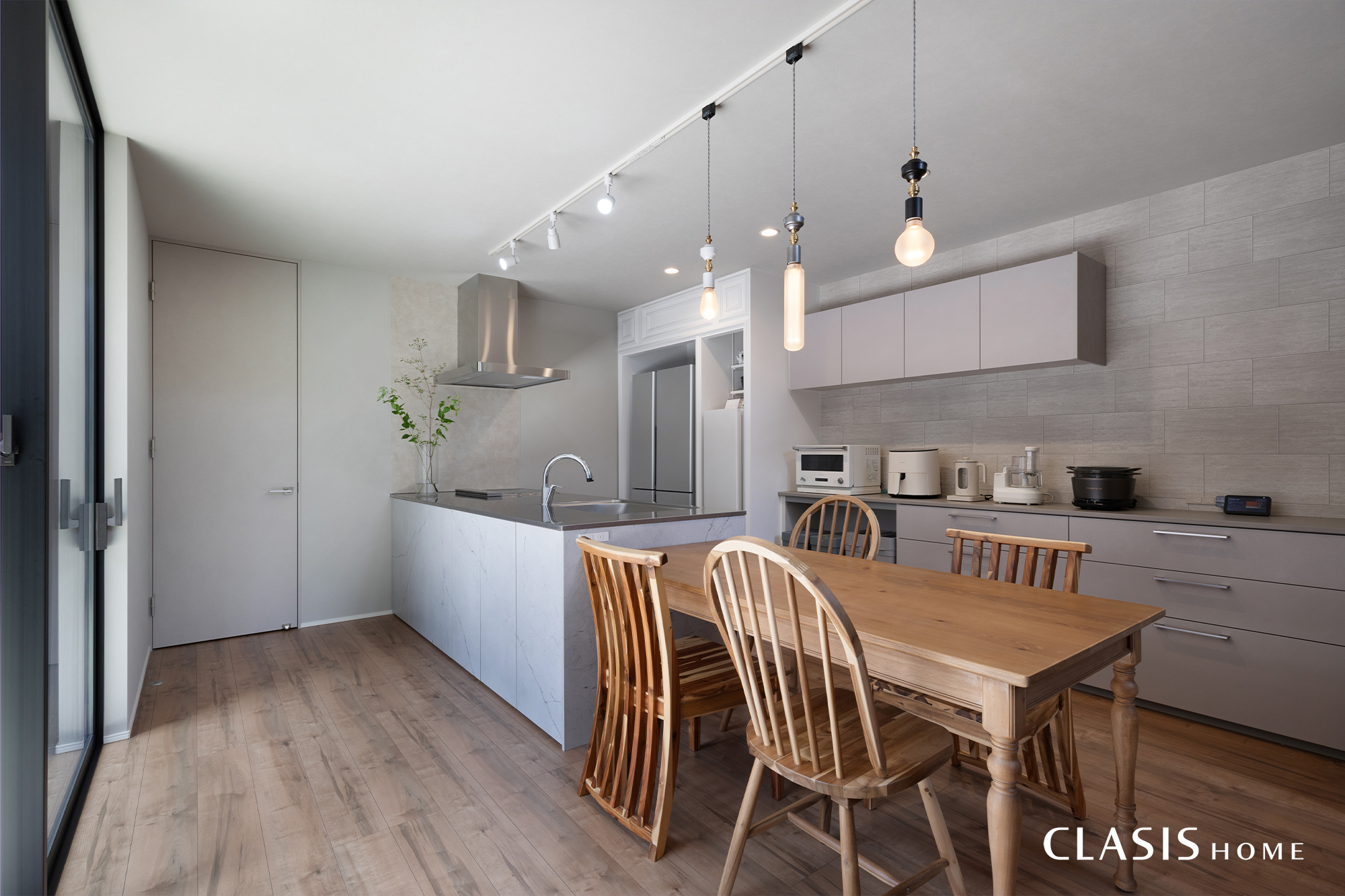 ラスティックな風合いを持つ床材をチョイスし、アンティーク感もプラス。木目のラフな雰囲気とグレーのモダンな雰囲気が調和しています。