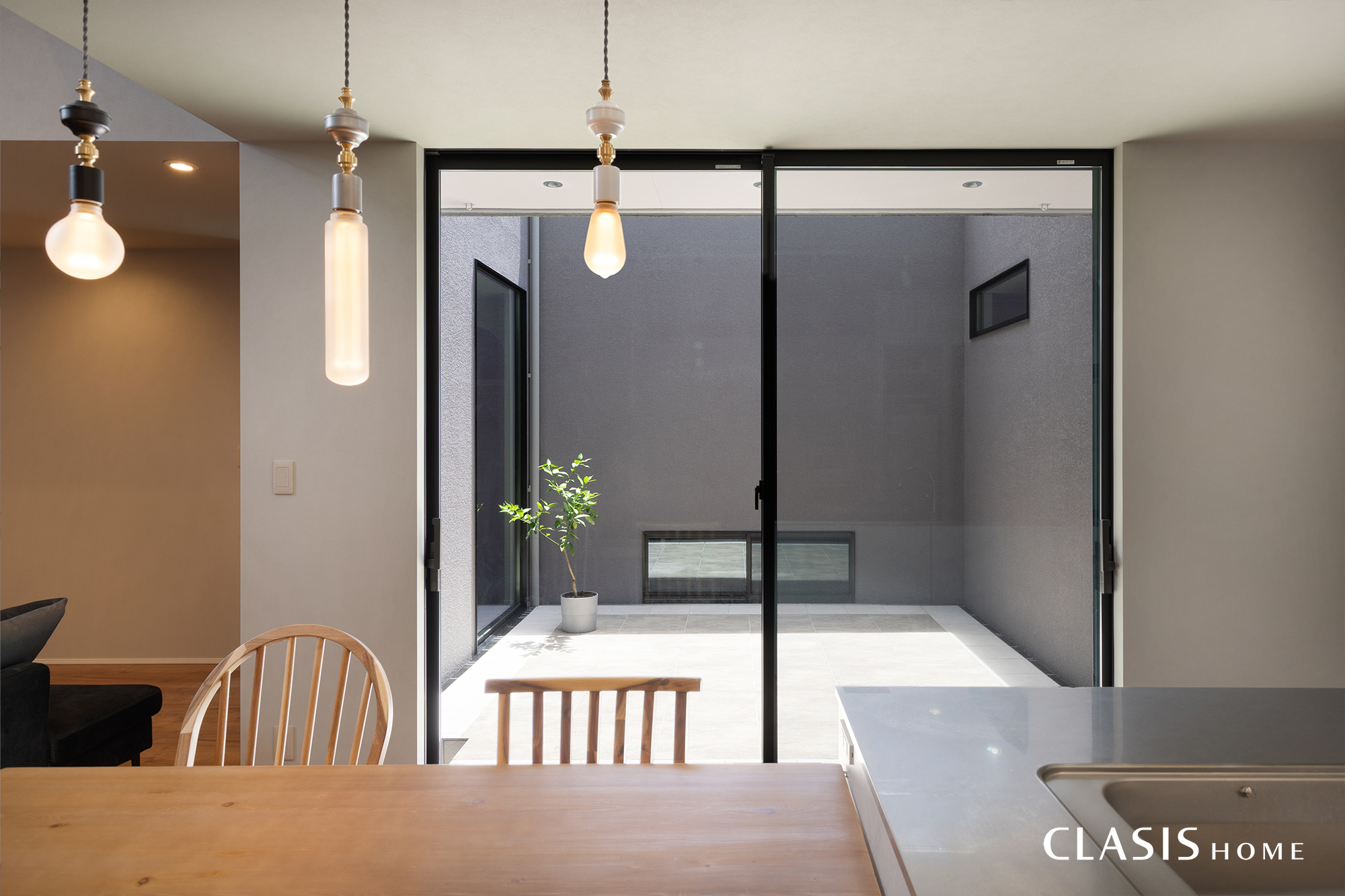 中庭からダイニングへ明るい光が注ぎます。視線が中庭に抜け、広々と感じられます。