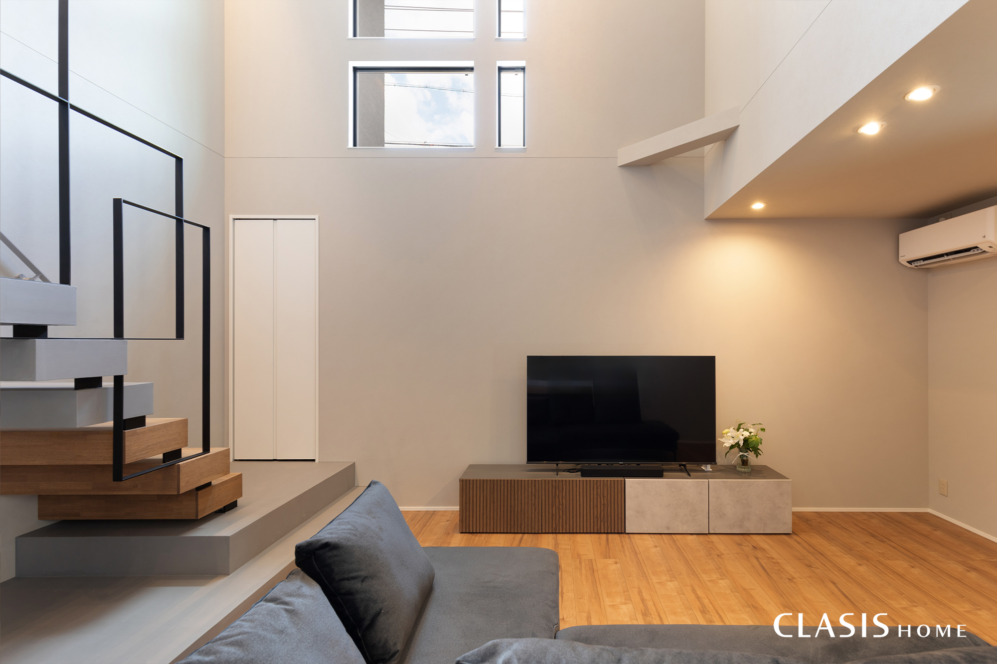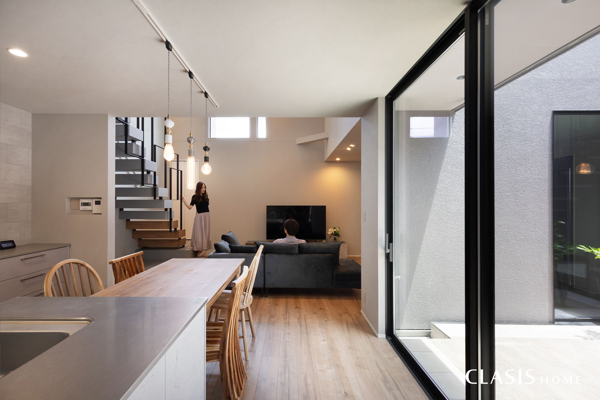 鉄骨階段を引き立たせるため、リビングは色数を抑えてシンプルに。