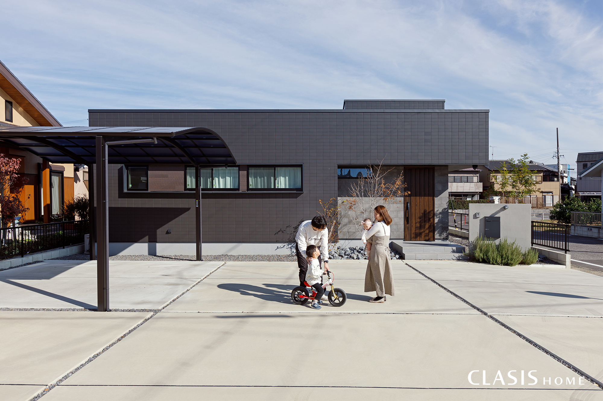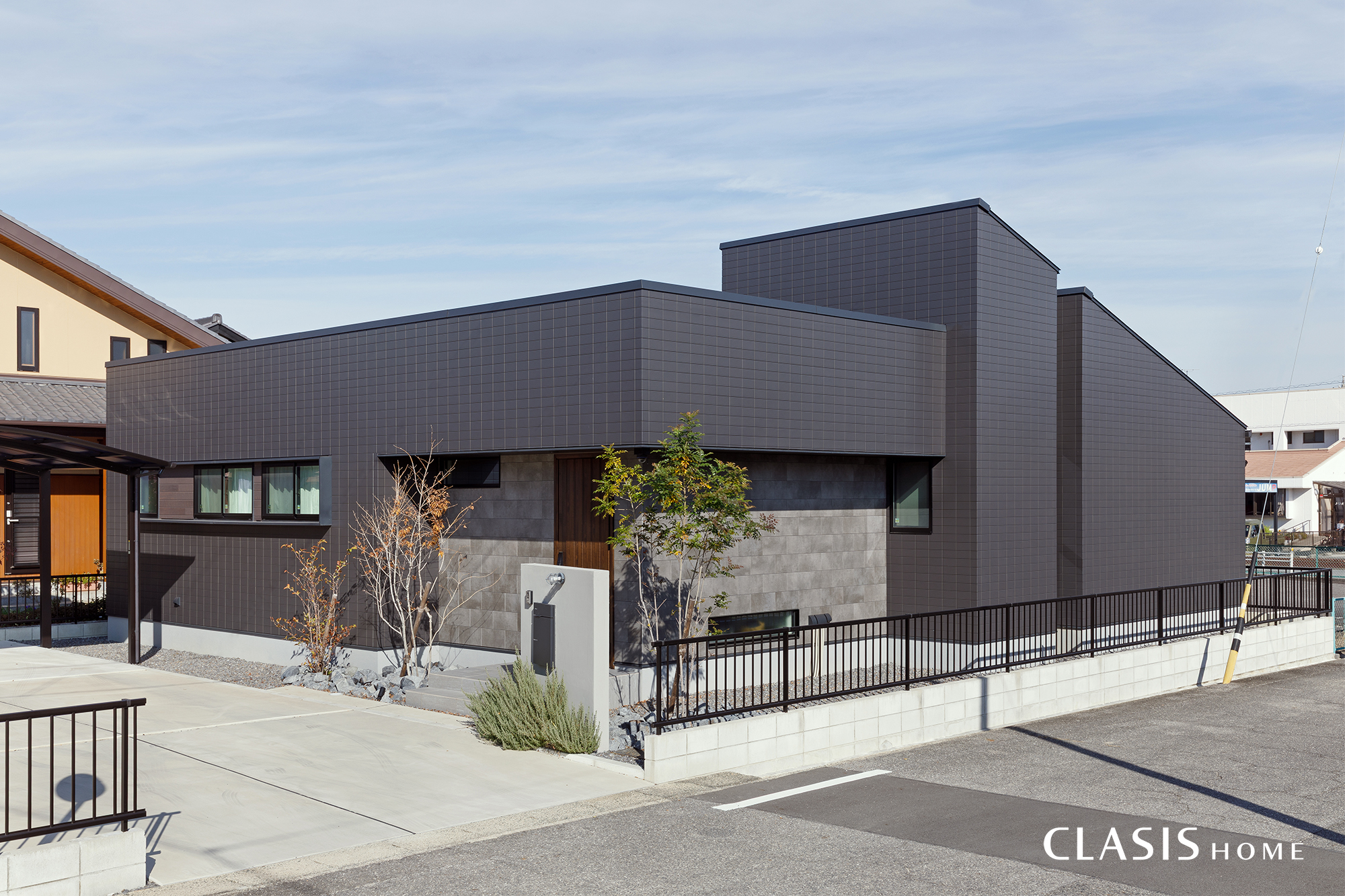 印象的な片流れの屋根に、スリットのようなラインを組み合わせて外観に程よい遊びや個性をプラスしました。手前の門柱や植栽が奥行き感を生み出し、モダンな中にも温かみを感じさせる佇まいに。高さに変化をつけたフォルムが、空の青さに美しく映えます。