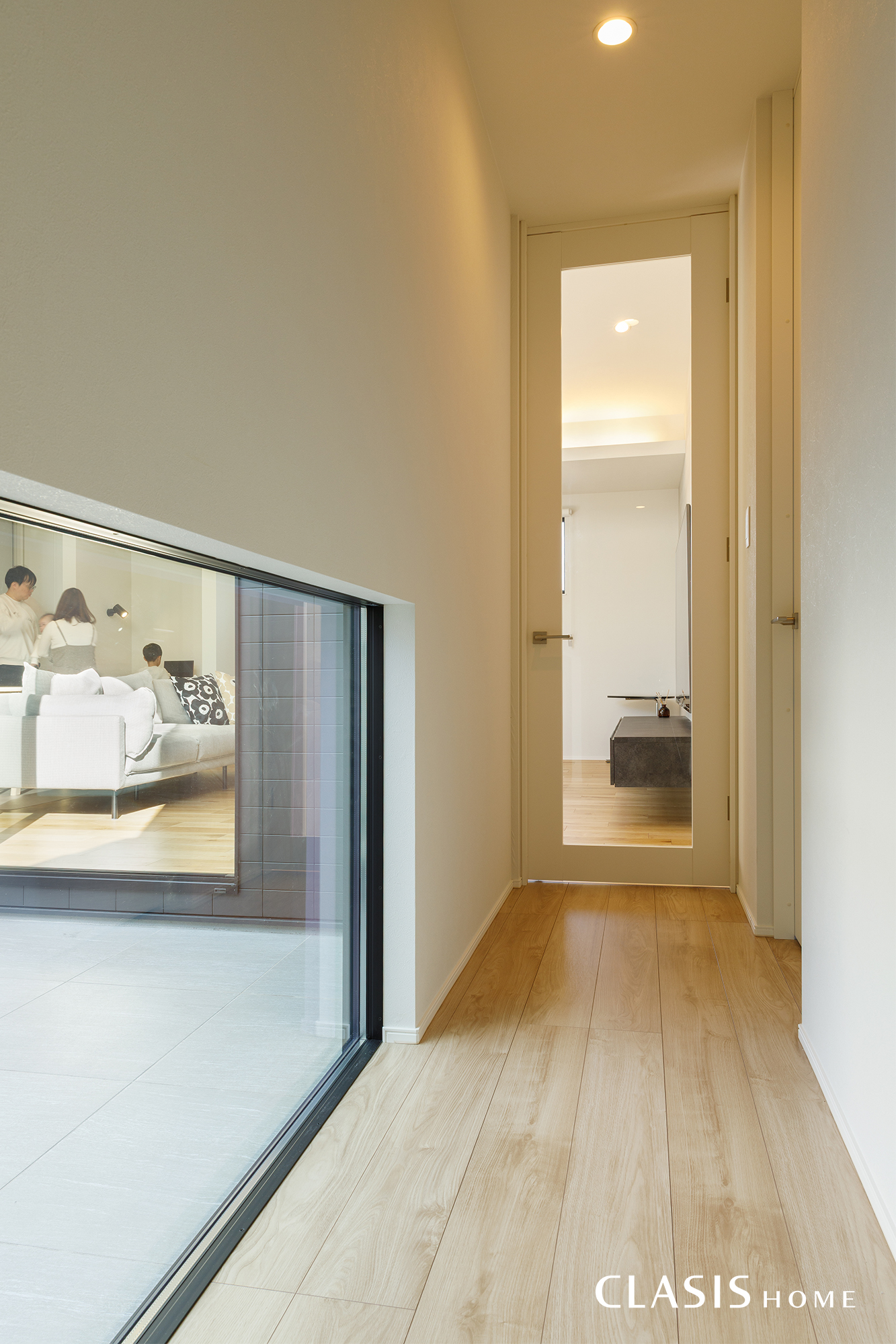 白を基調にミニマルにまとめた玄関ホールは、扉付きのシューズクローゼットで生活感を隠し、常にすっきりとした印象を保てます。廊下には中庭を望む地窓やガラス戸を配置。視線が抜ける工夫を凝らすことで、閉塞感を感じさせない開放的な動線を実現しました。