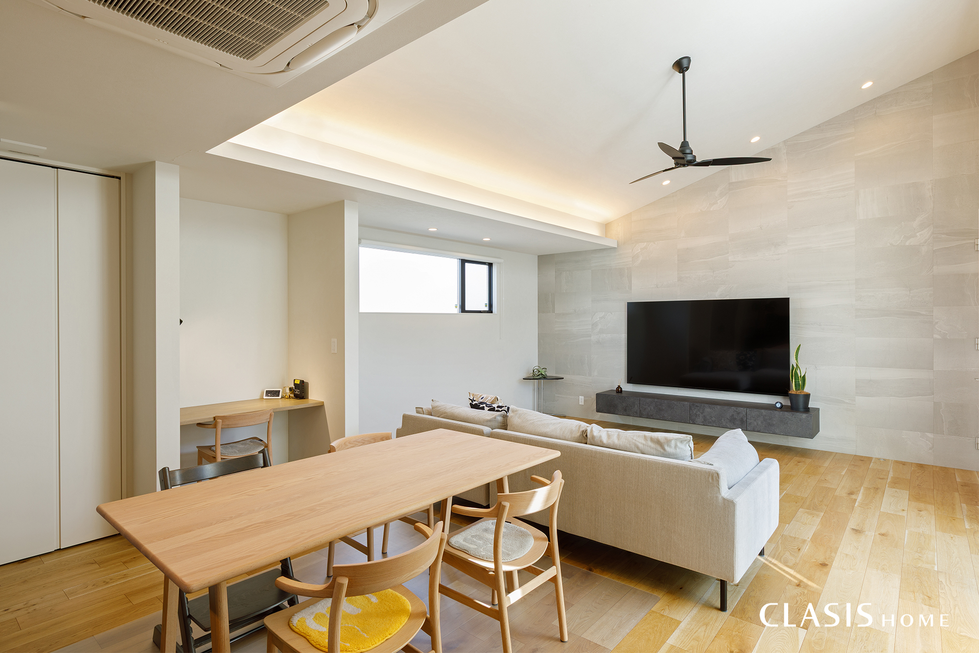 勾配天井と間接照明を組み合わせることで、上部への広がりを強調し、より開放感あふれるリビングに仕上げました。TV背面に採用したエコカラットは、主張しすぎず空間に溶け込む柔らかな色合いをセレクト。素材の質感がシンプルでナチュラルなデザインの中に深みを生み出しています。