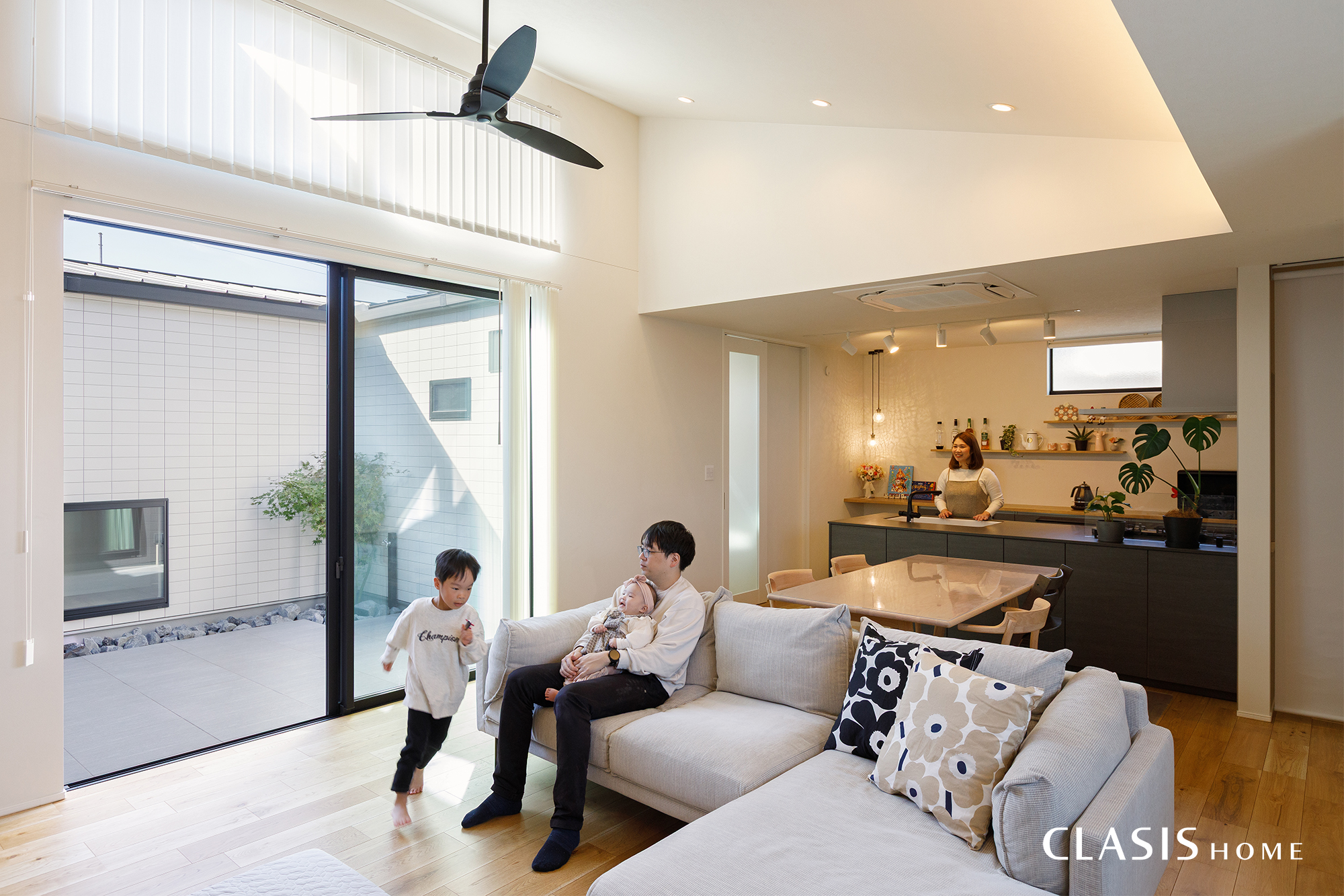 リビングには中庭が併設されており開放感のある空間に。お打ち合わせ段階から中庭との繋がりを意識し、窓の配置や素材感を吟味しました。大開口の窓越しに中庭を眺めながら、家族が自然と集まり、思い思いの時間を過ごせる心地よい空間です。
