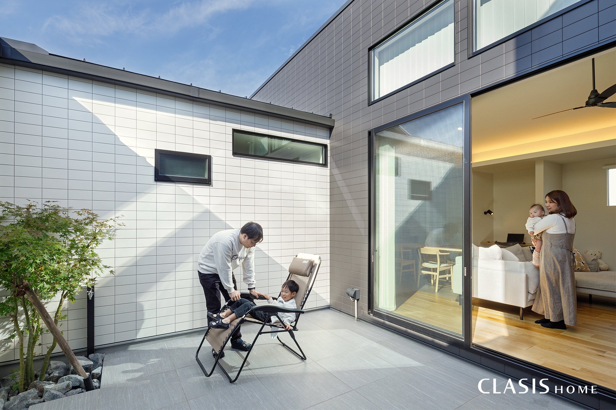 ロの字型に囲うような配置で、外からの視線を完全にシャットアウトしたプライベートな中庭。カーテンを開け放したまま、太陽の光と風を感じてリラックスできる、暮らしにゆとりをもたらす空間です。