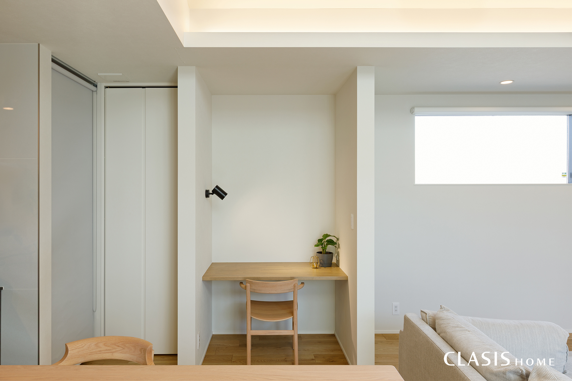 キッチン背面には、お施主様こだわりの小物をディスプレイできる飾り棚を設け、毎日の家事が楽しくなるような空間に。カップボードの横にはお子様用のスタディスペースを併設しました。お料理中も目が届く距離で、お子様が絵本を読んだりお絵描きをしたりと、自然と親子の関係が深まるような設計です。